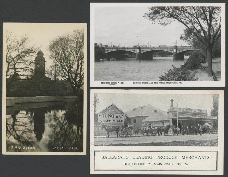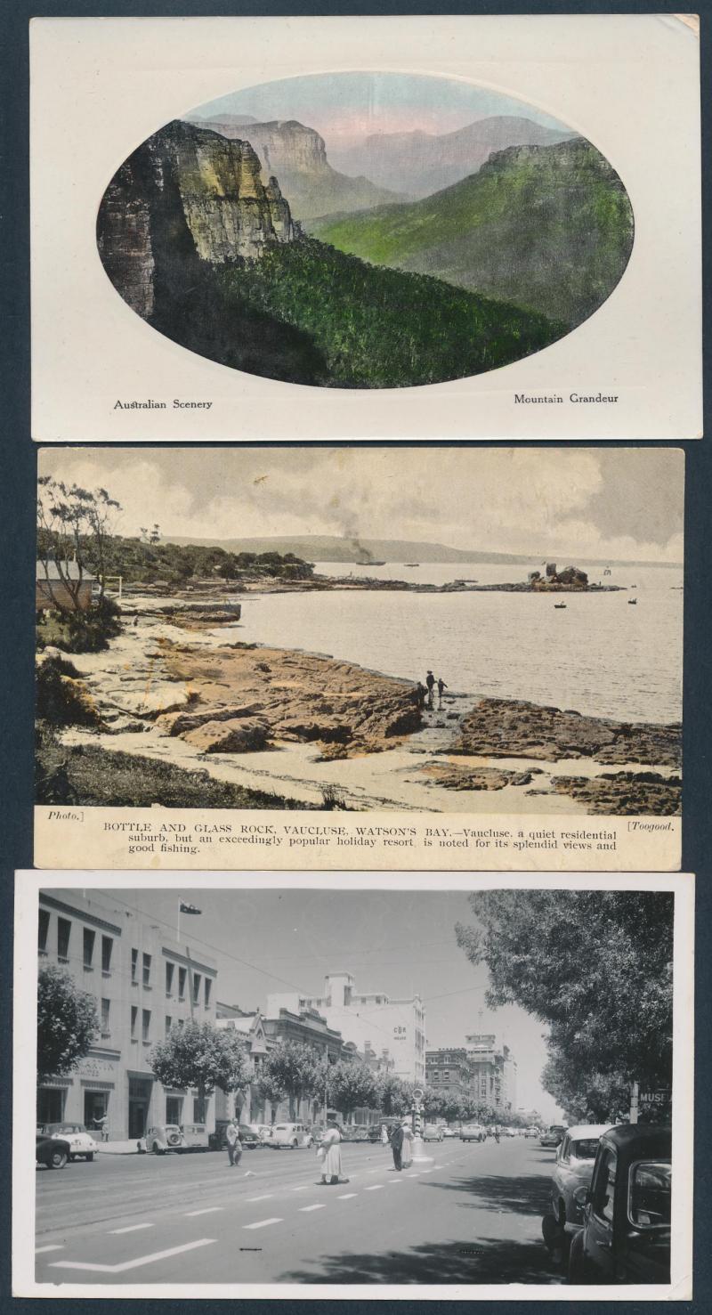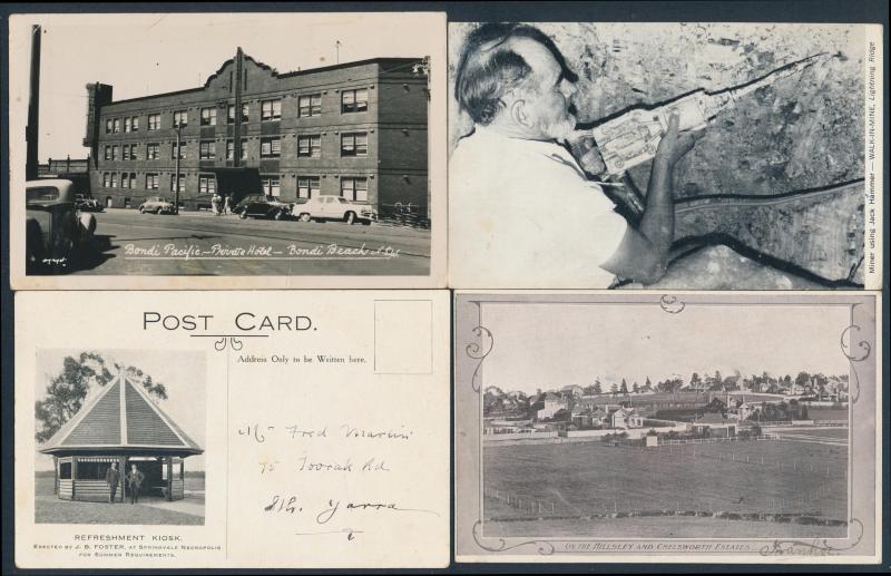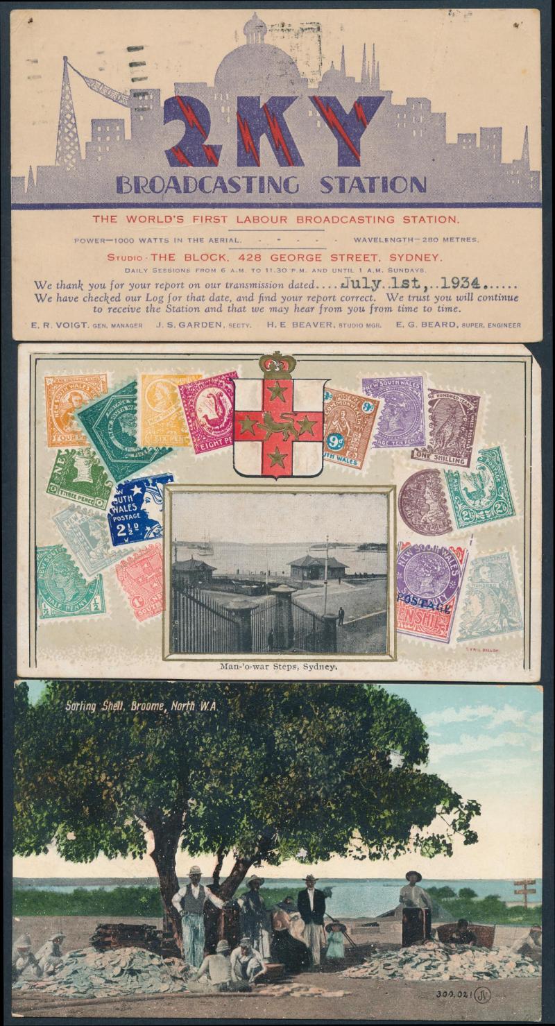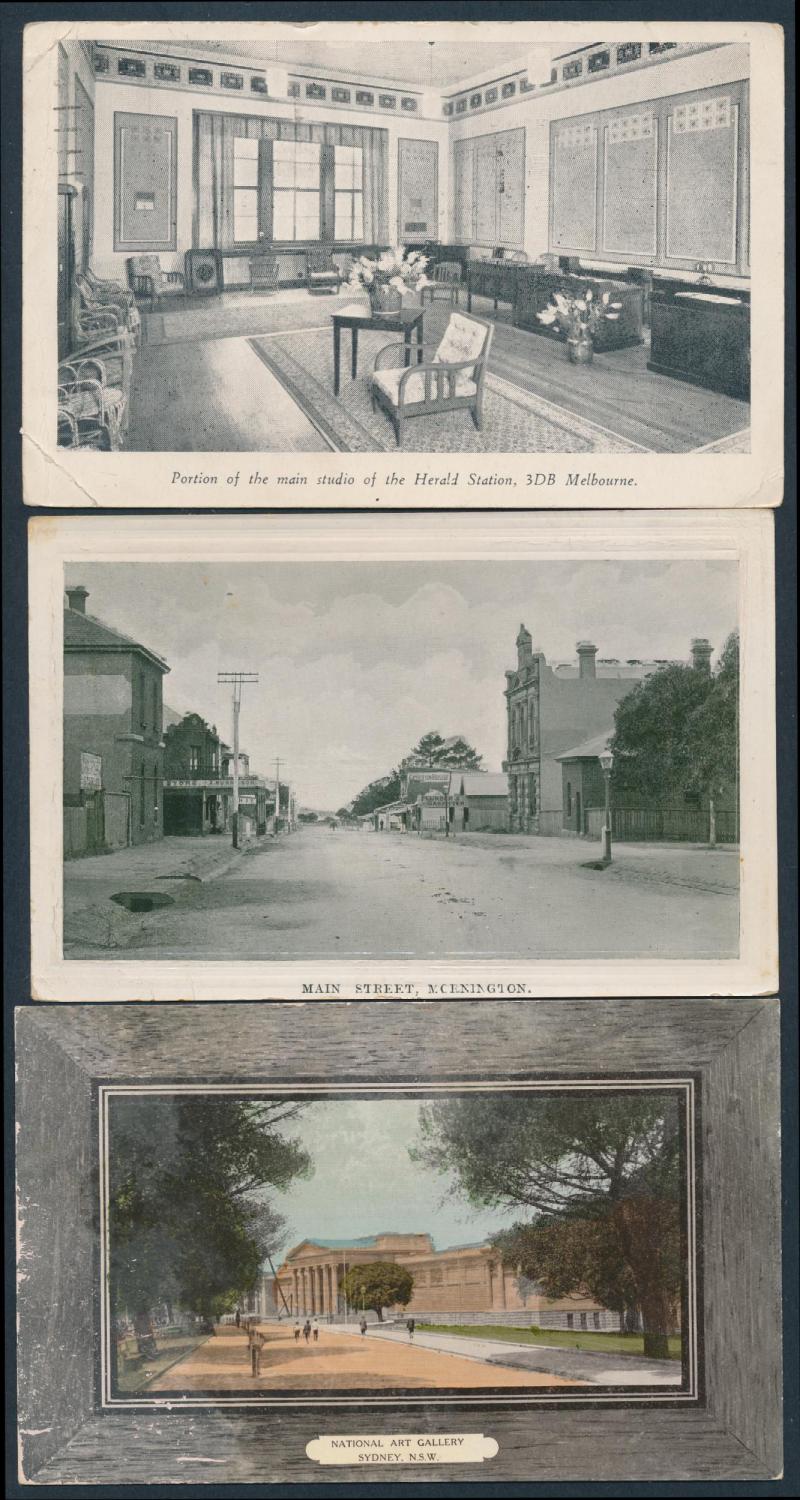 stamps cards with inset views x3, a few advertising cards including for 'MacRobertson's Mammoth All Round Australia Expedition 1928', Radio Station 2KY and 'Refreshment Kiosk/...at Springvale Necropolis', Melbourne suburbans, Opening of George Bridge