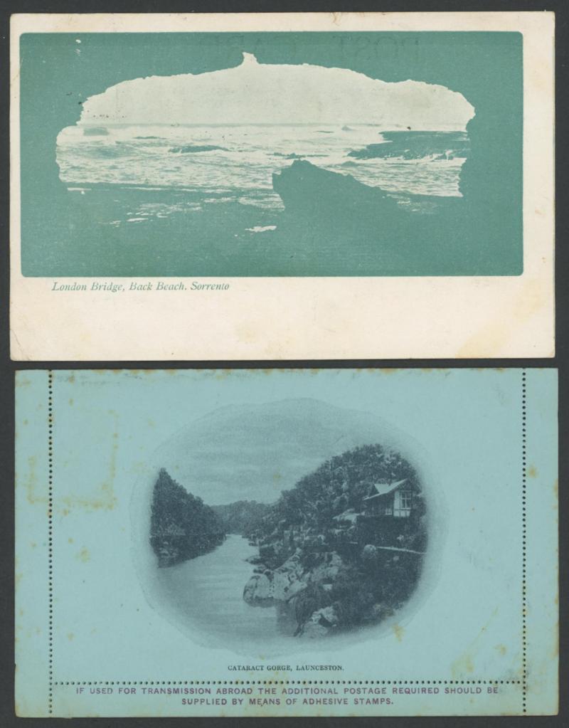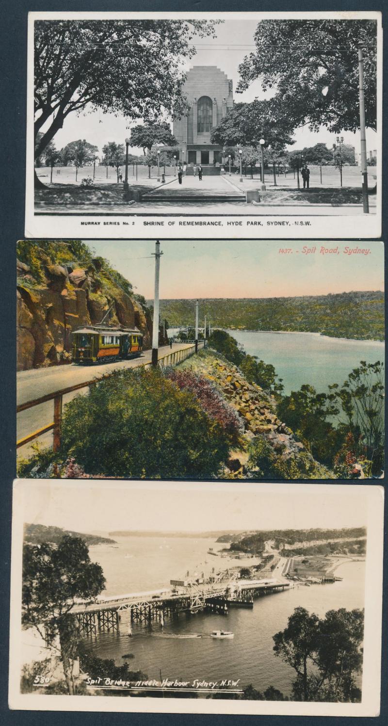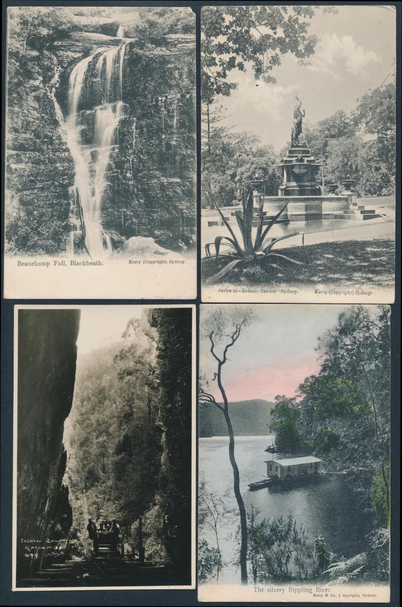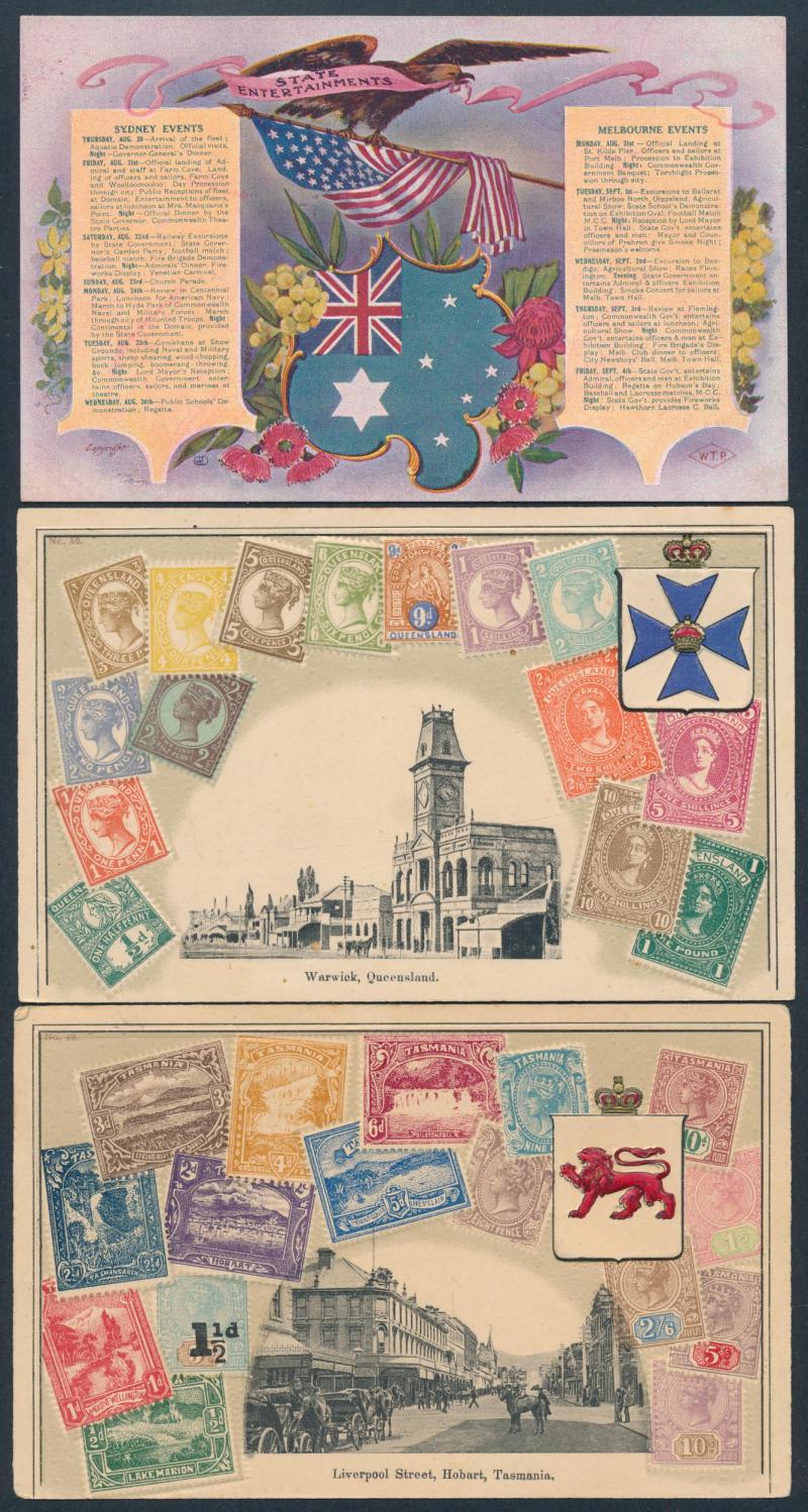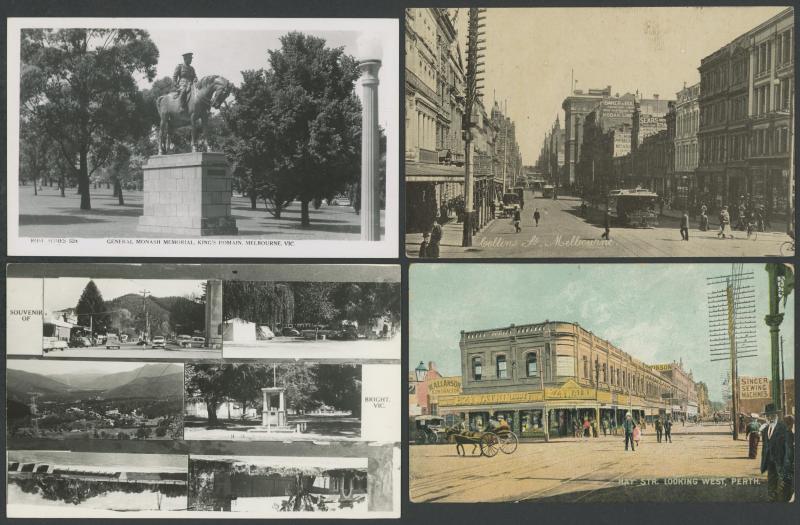 stamps cards with inset views x3, a few advertising cards including for 'MacRobertson's Mammoth All Round Australia Expedition 1928', Radio Station 2KY and 'Refreshment Kiosk/...at Springvale Necropolis', Melbourne suburbans, Opening of George Bridge