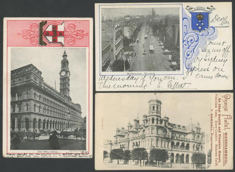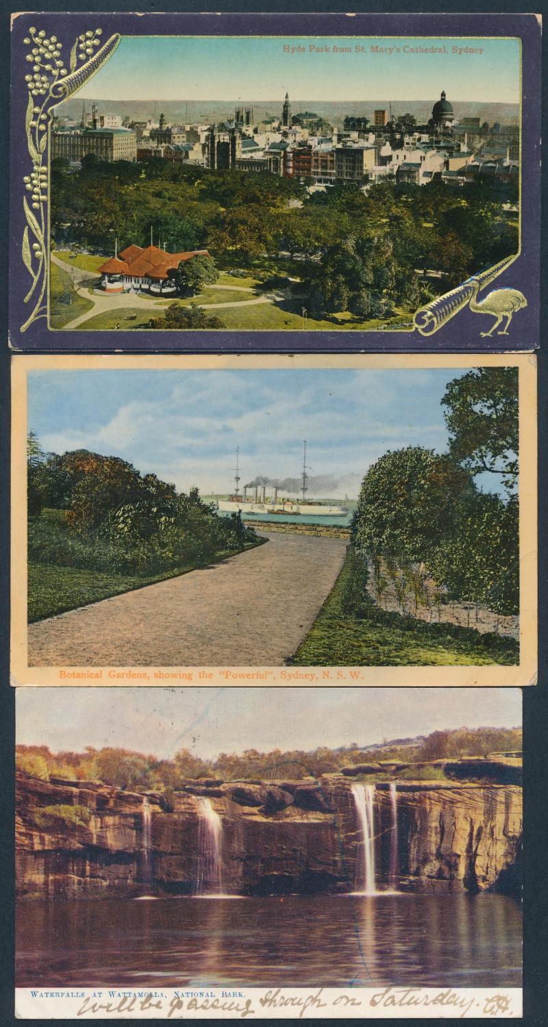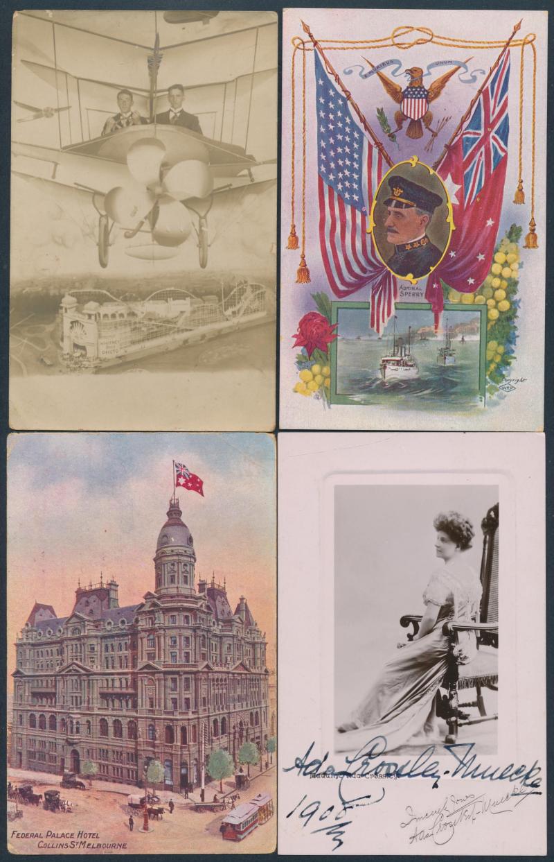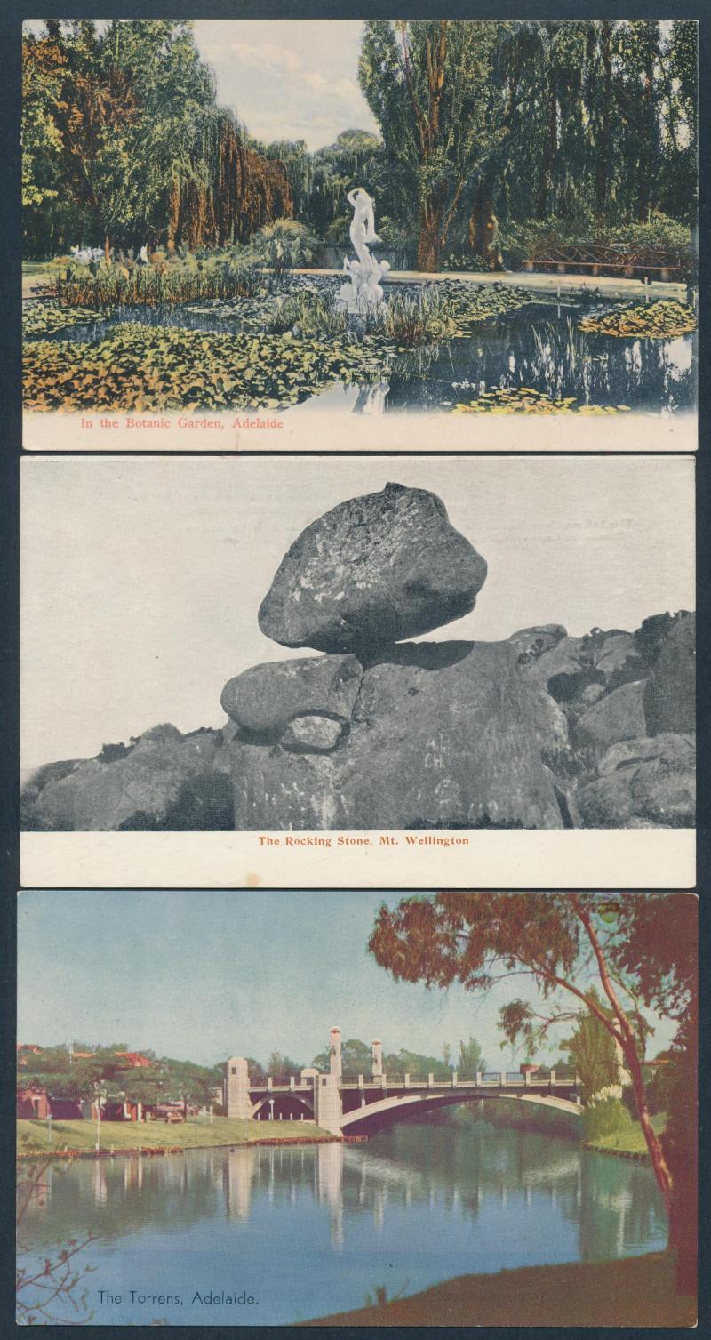 Office Tenterfield', 'OBI/(Adelaide)/ Gymnasium/ Teaching/Staff', Tuck's advertising card for 'Hotel Esplanade Perth WA/...' (hotel & lawn bowls), 'Landing Place, Sydney Bay, Norfolk Island', etc, also better Theatre cards by Kelly (Bendigo), Nuttall