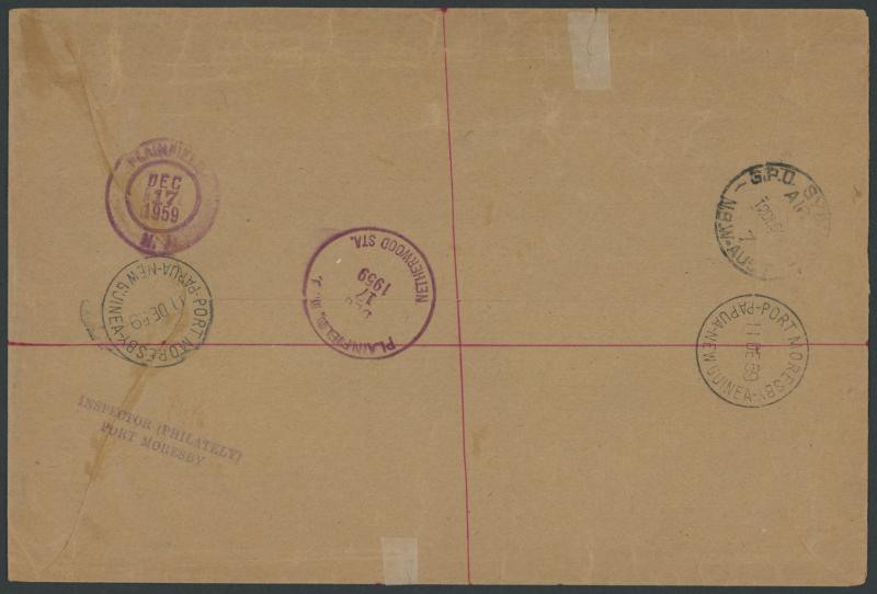 franking of £1 Fisherman & 5/- Coffee + 1952 ½d & 1d tied by superb 'PORT MORESBY' cds, the reverse with 'INSPECTOR (PHILATELY)/PORT MORESBY' cachet that we have not previously seen, Sydney transit & large 'PLAINFIELD NJ/DEC/17/1959/NETHERWOOD STA'