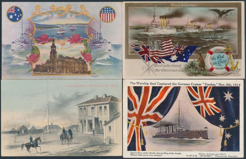 Small box with better cards including 1908 Visit of US Fleet chromolithos x3, 1914 HMAS 'Sydney' after "capturing" the 'Emden', VSM