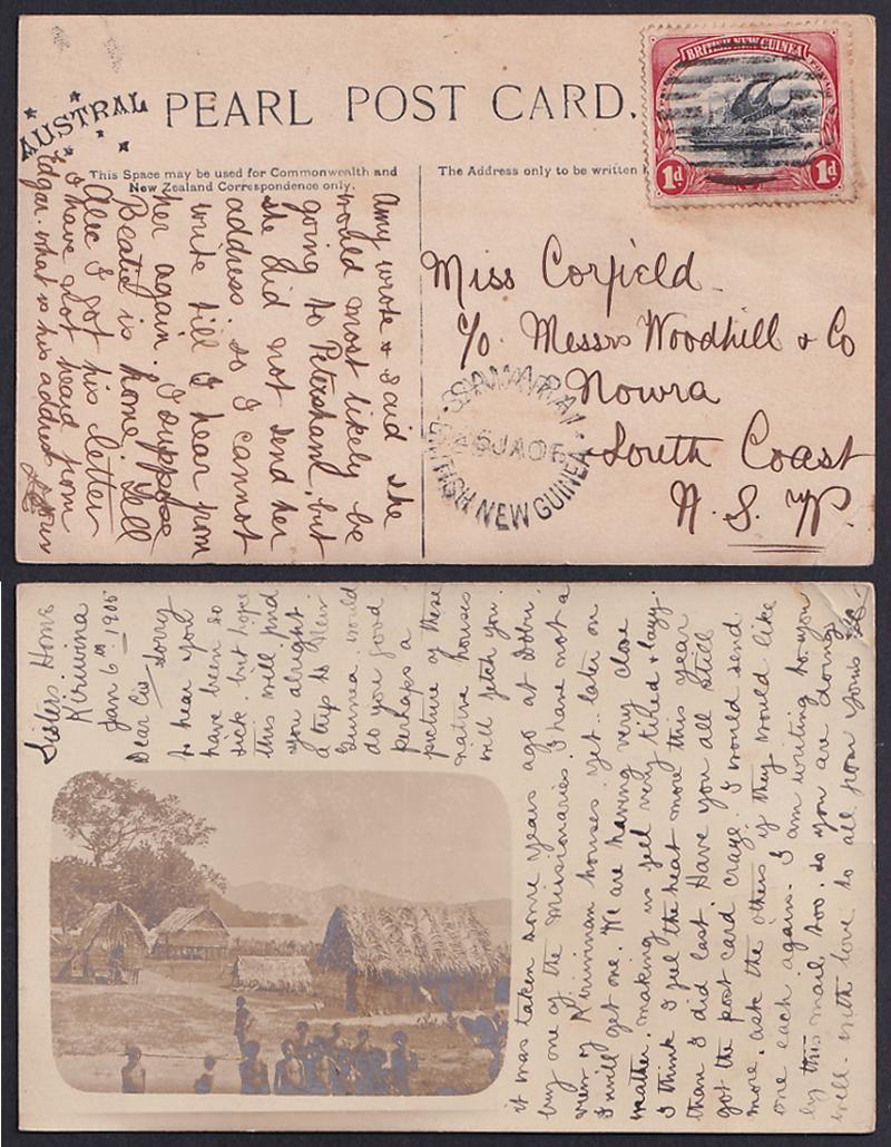 "Sister's Home, Kiriwina, Jan 6th 1905" which explains that the image "was taken some years ago at Dobu by one of the Missionaries. I have not a view of the Kiriwinan houses yet", to Australia with BNG 1d with 'BNG'-in-bars cancel and slightly