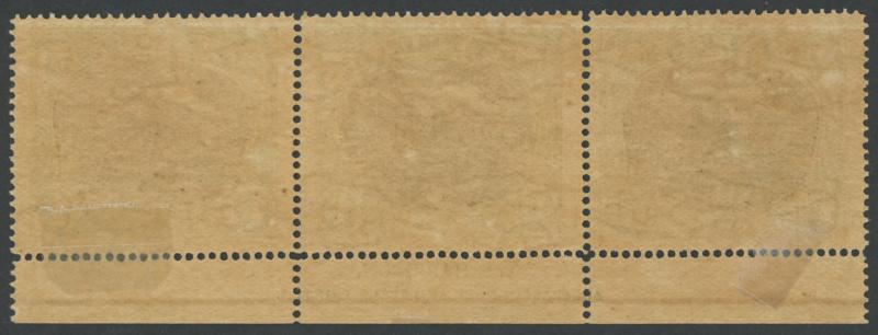 Harrison Imprint strip of 3 from the base of the sheet, characteristic minor gum tropicalisation, two units with small hinge remainders, the central unit unmounted. Unlisted in Gibbons. Rosenblum states (page 43) that "At first, a deep carmine was