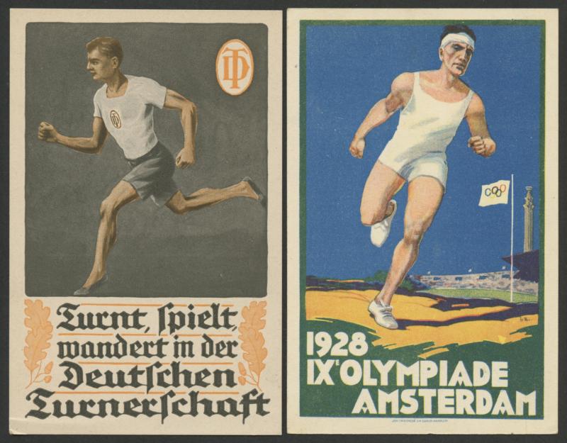 Fund, and 1930s Deutschen Turnerschaft (= German Gymnastics) featuring a runner, all very fine to superb unused; also a slightly larger plain back 1920s advertising card for Otto Hierneis of a young soccer-player & female referee (?) with corner
