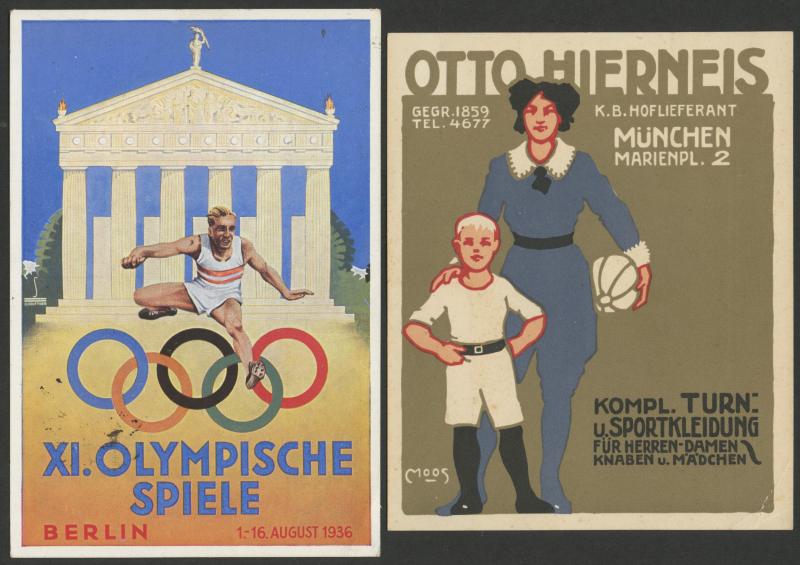 crease at lower-right; and 1926 Hungarian Kellner u Mohrluder 'SPORT/TORTENETI/KIALLITAS/...' (= Historical Sports Exhibition) artist card of a discus thrower 'signed' at upper-left 'Manno Miltiades', very fine unused.