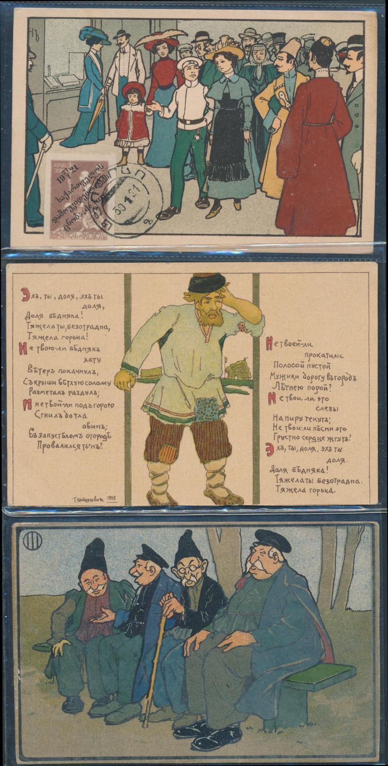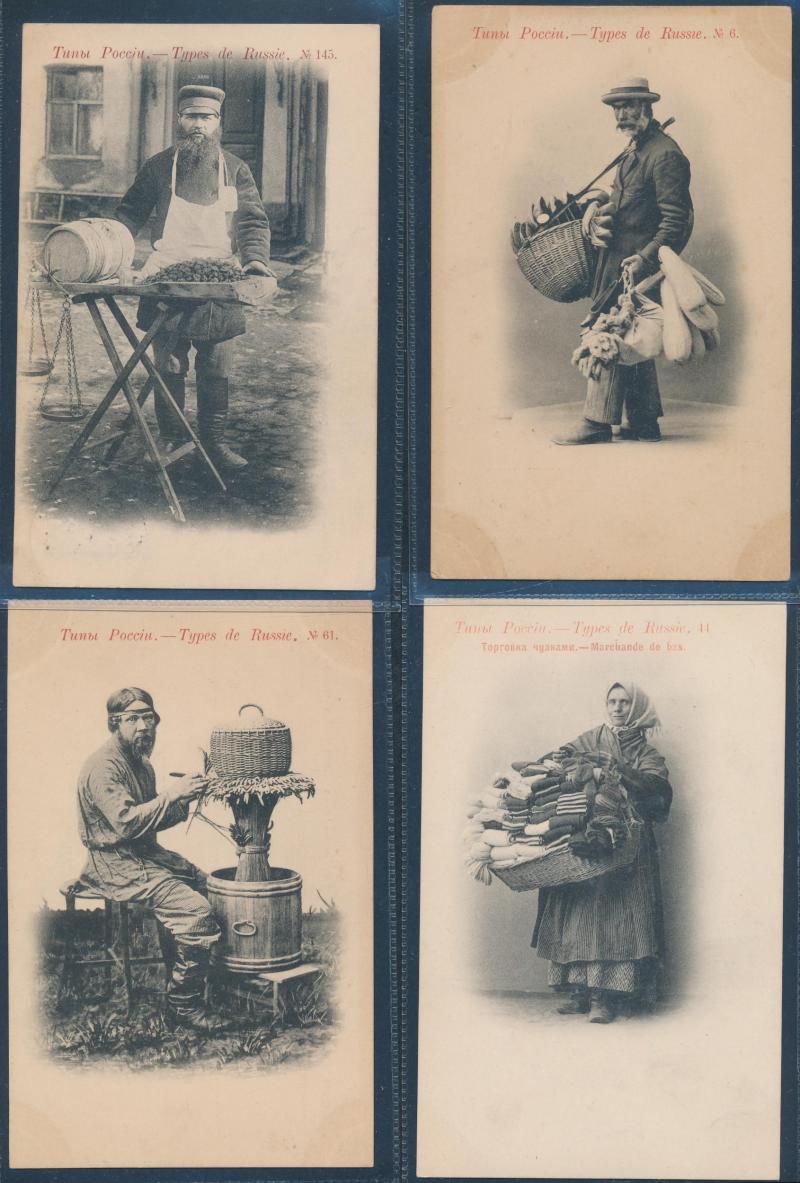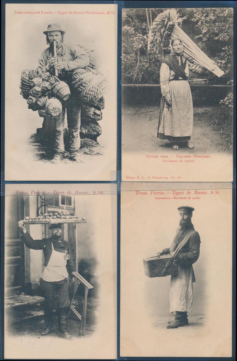 RUSSIA: 1900-04 (circa) Undivided Backs of various artisans or vendors x12 (two used), circa 1905 artist card of peasant & verses
