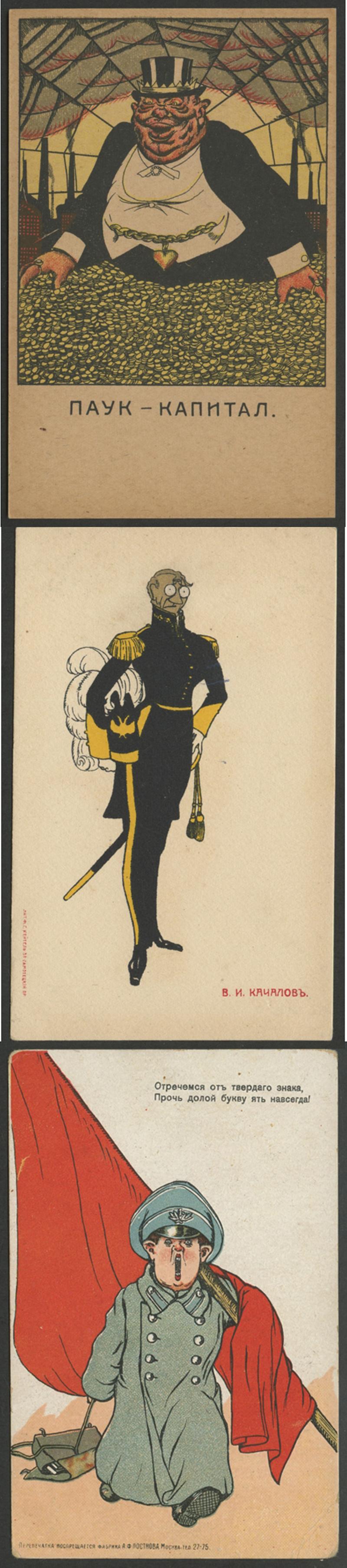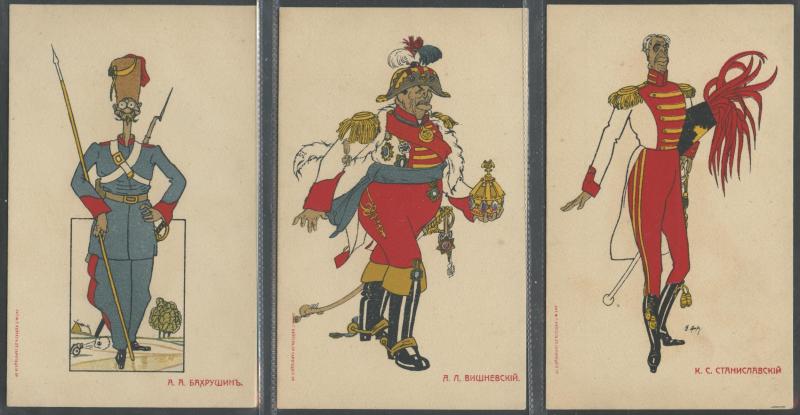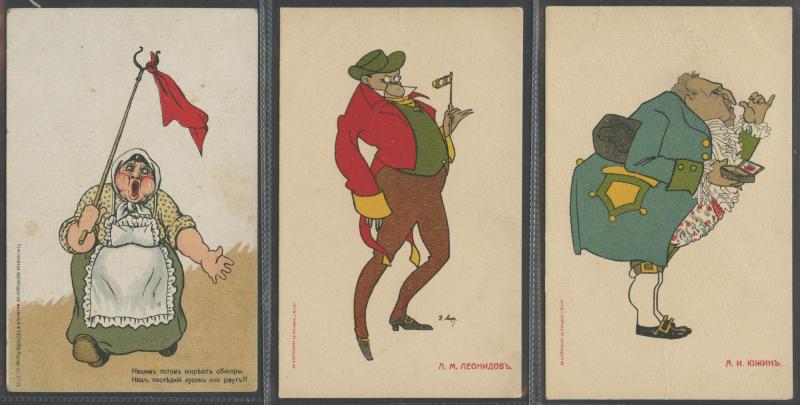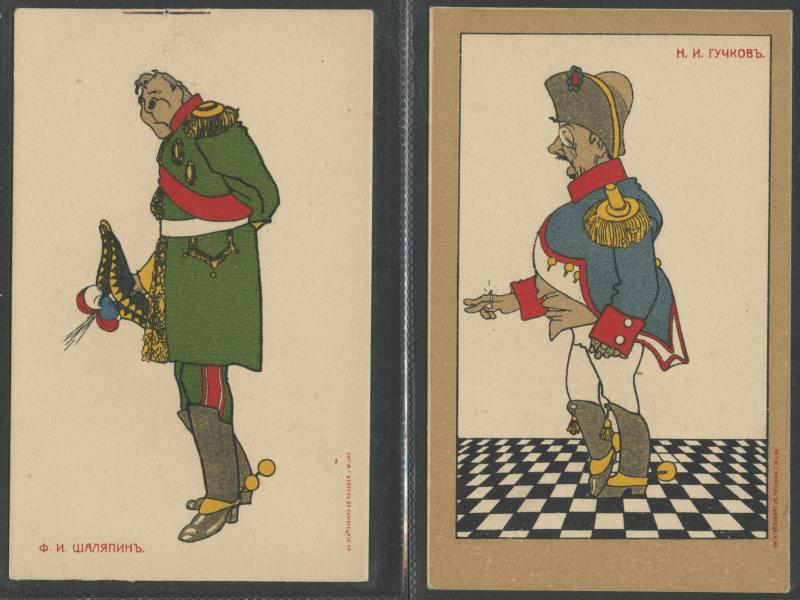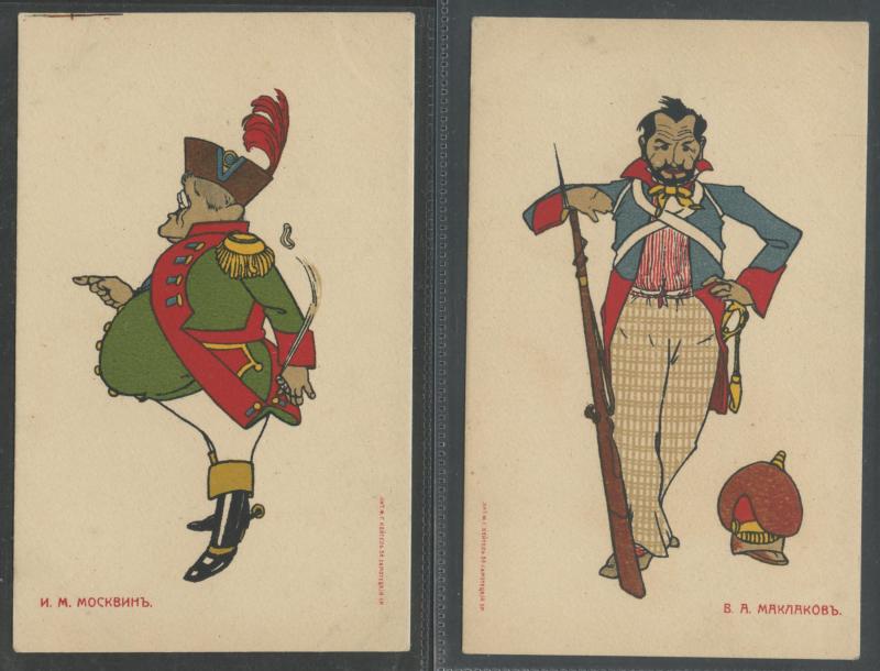 RUSSIA: 1910 (circa) satirical artist cards lampooning the pomposity of the aristocracy & military, one of a banker as a huge