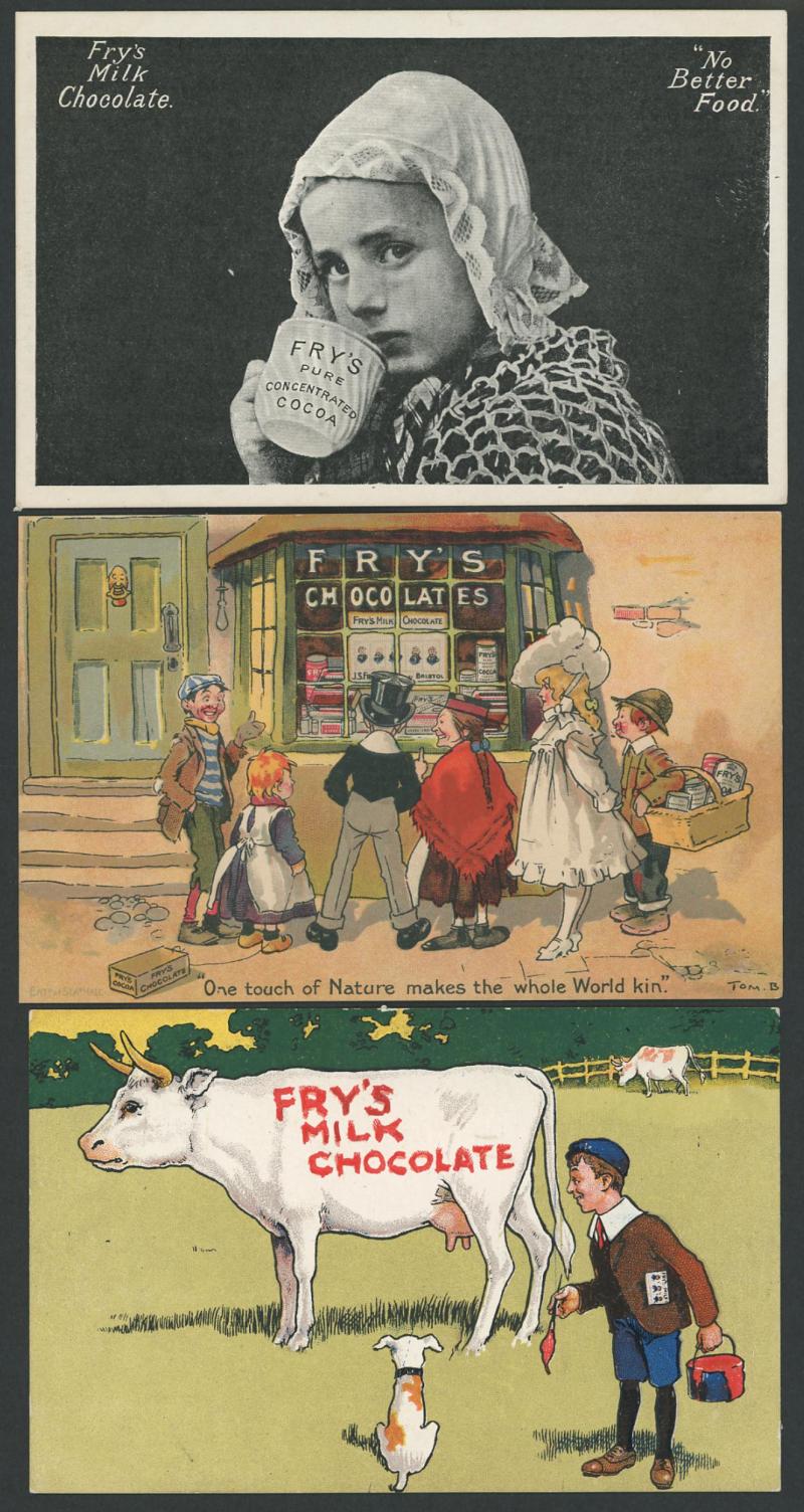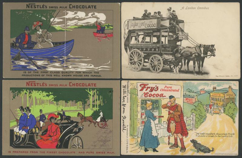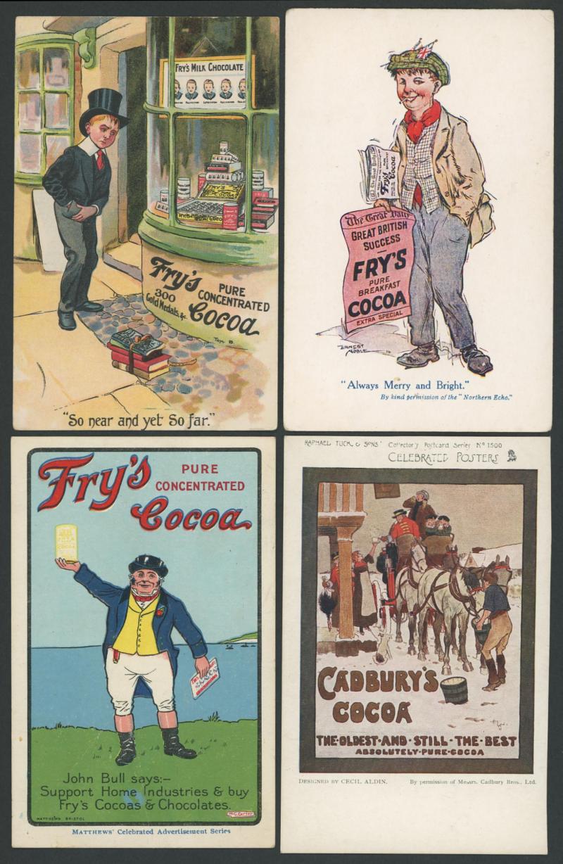 ADVERTISING: Mostly artist cards for British chocolate makers Fry's x9, Cadbury, Nestlé x2 and Taylor Bros, fine to very fine.