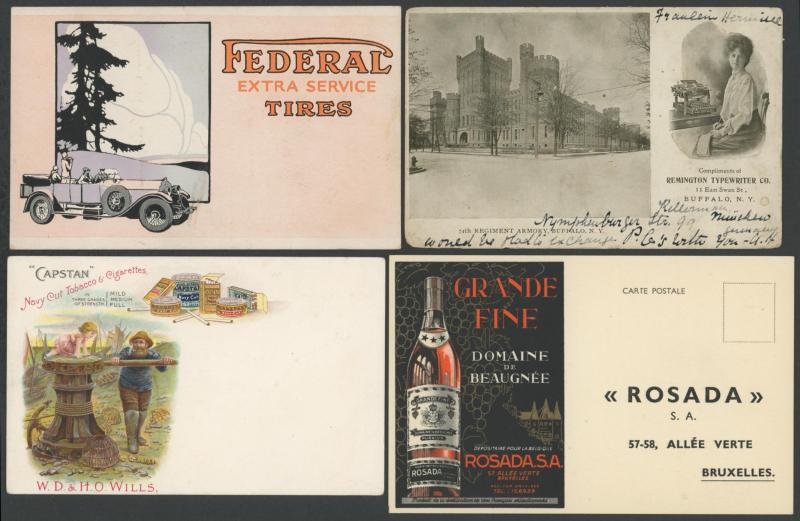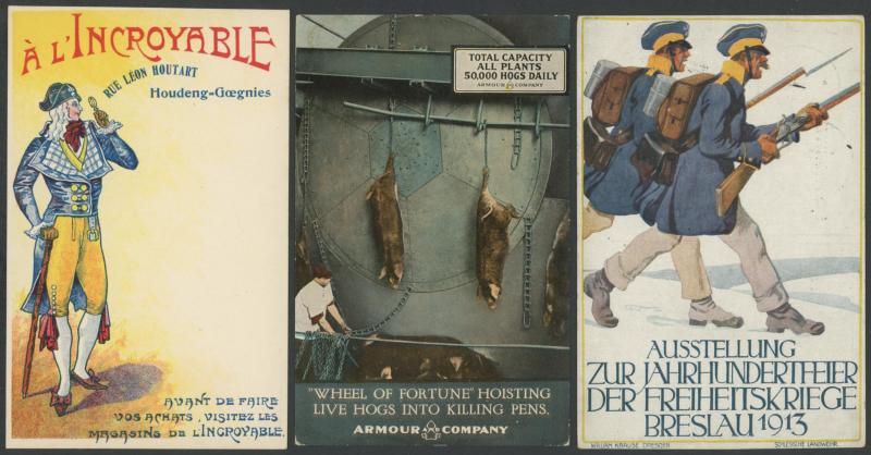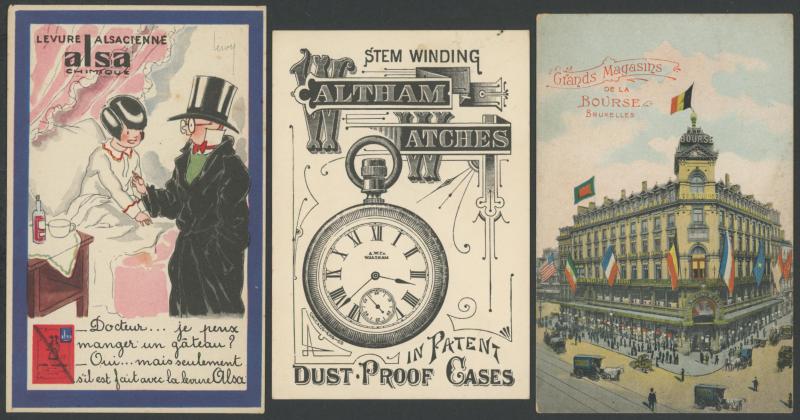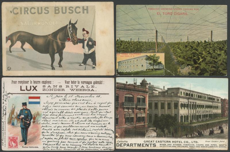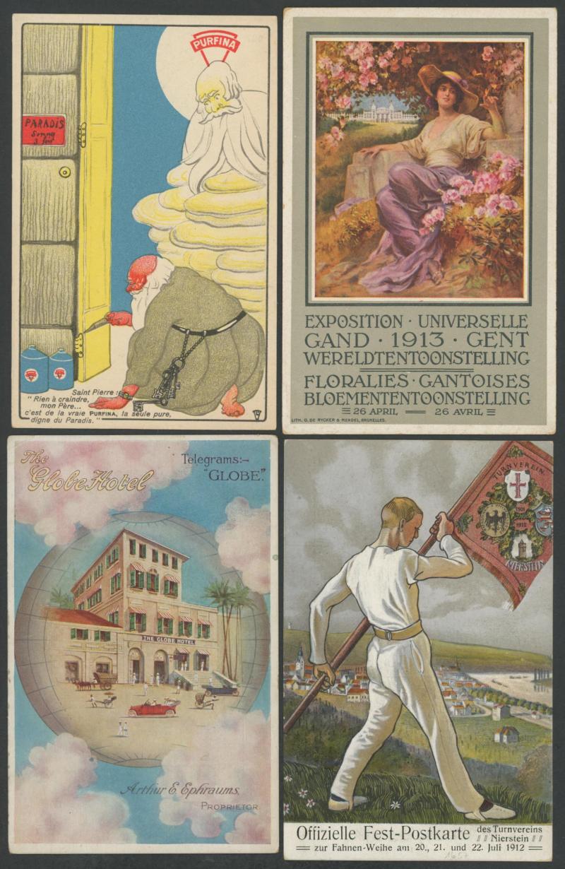 products, hotels, exhibitions, tourism, etc, strength in artist cards with some Art Nouveau elements, some soiling but generally fine to very fine, mostly unused.