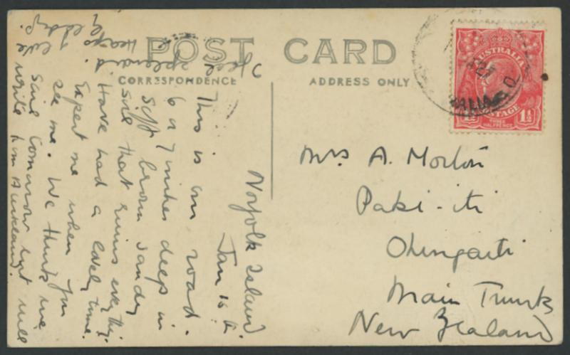 NORFOLK ISLAND: 1927 real photo PPC 'Watermill Valley NI' social usage to New Zealand with KGV 1½d red tied by poor 'NORFOLK