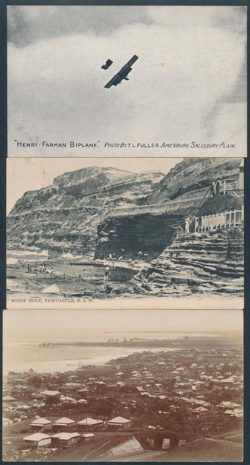 Katoomba humourous types unused, WWI French bombed towns, Valentine's Aircraft Recognition cards; also album of aircraft photos and related ephemera, condition overall very fine.