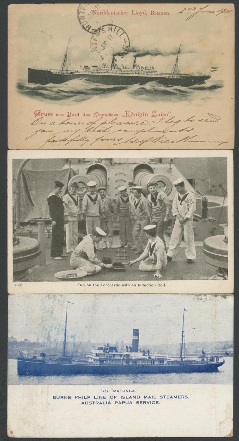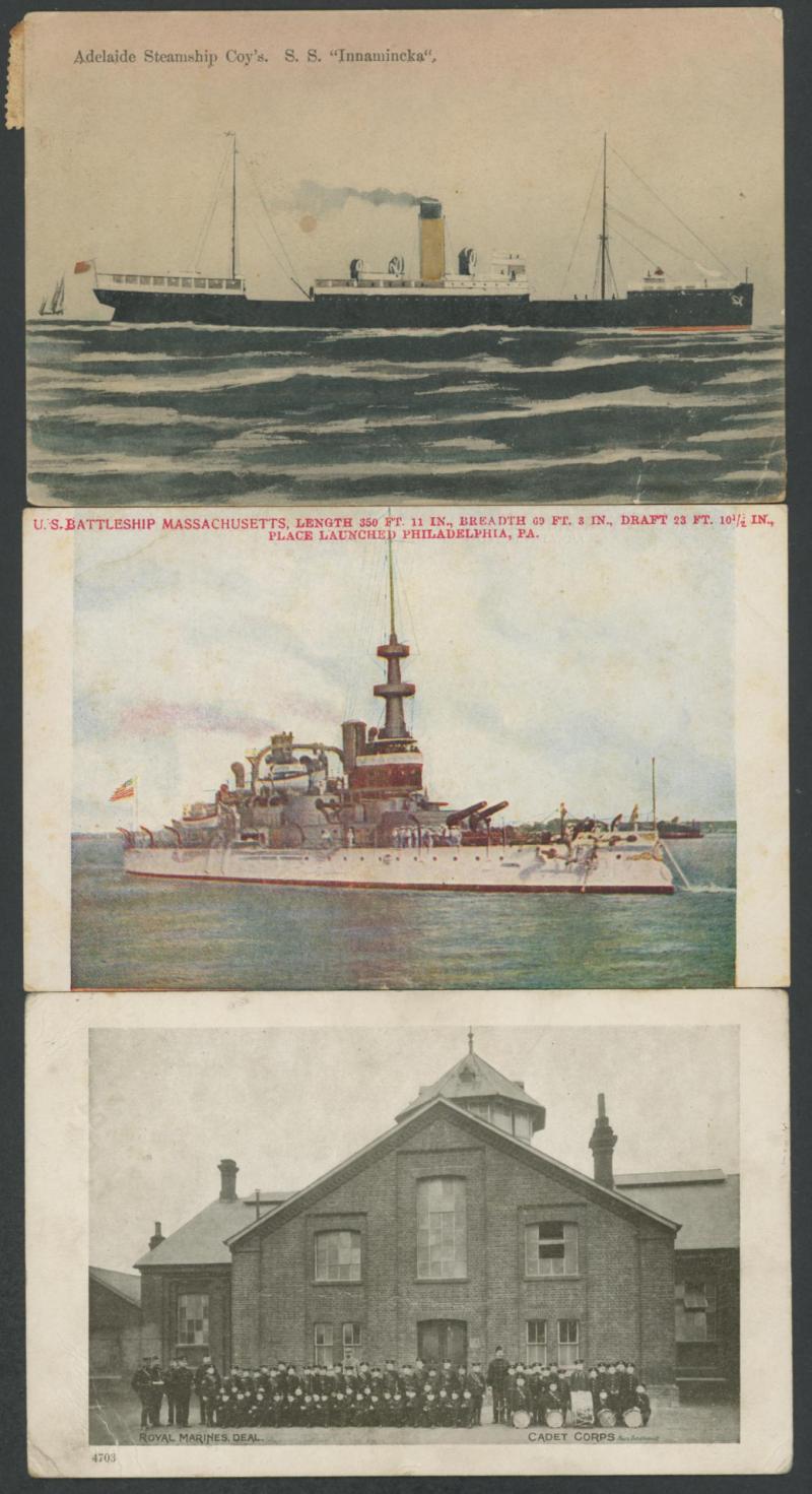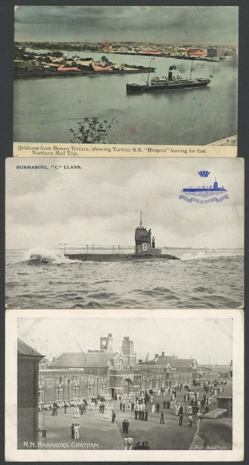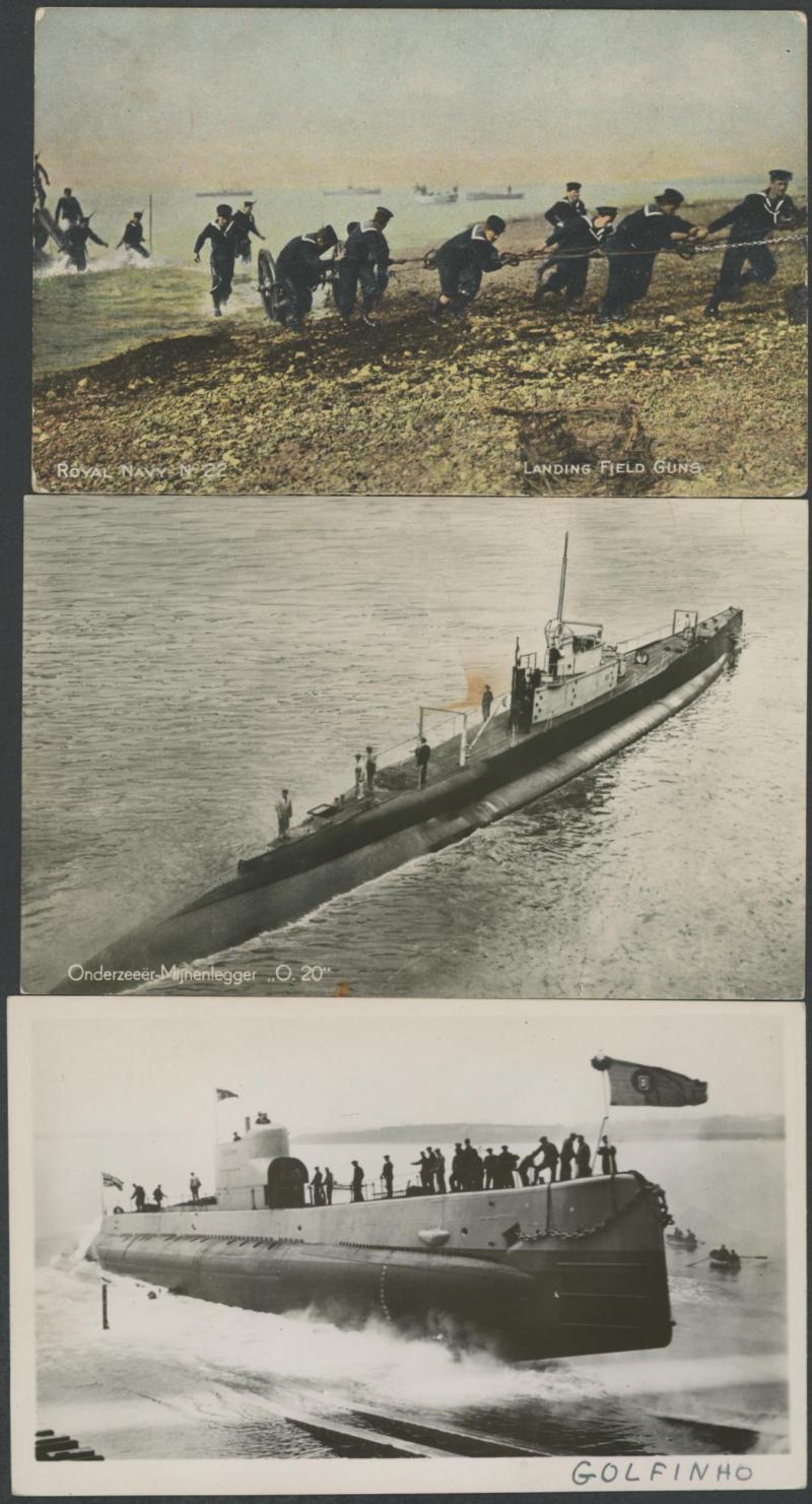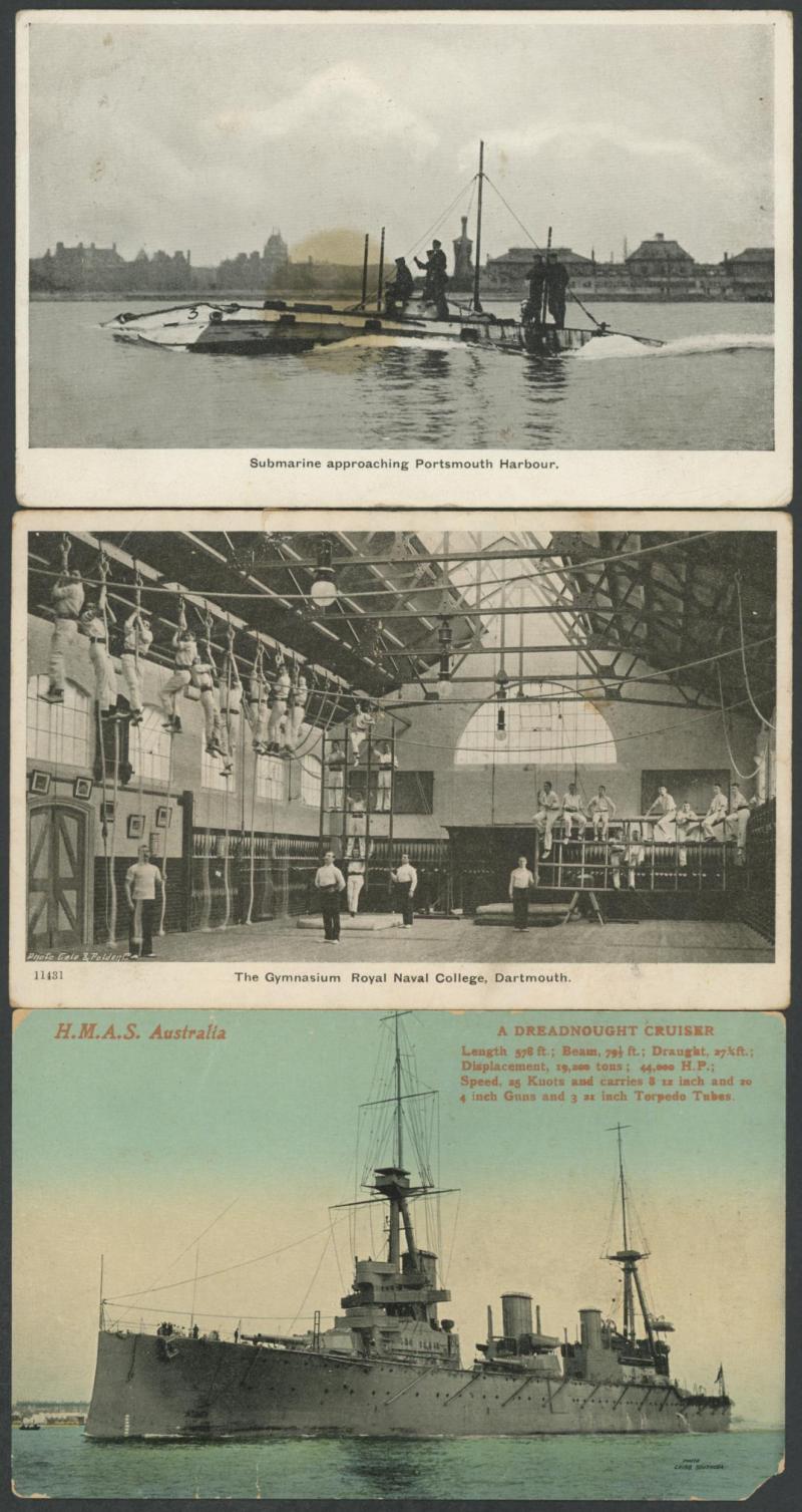 naval ratings & officers, some Australia including 1908 Visit of the American Fleet x2, strength in British cards, many from other countries including of a Portuguese submarine, etc, one unaddressed card with stamp on the message-side tied by