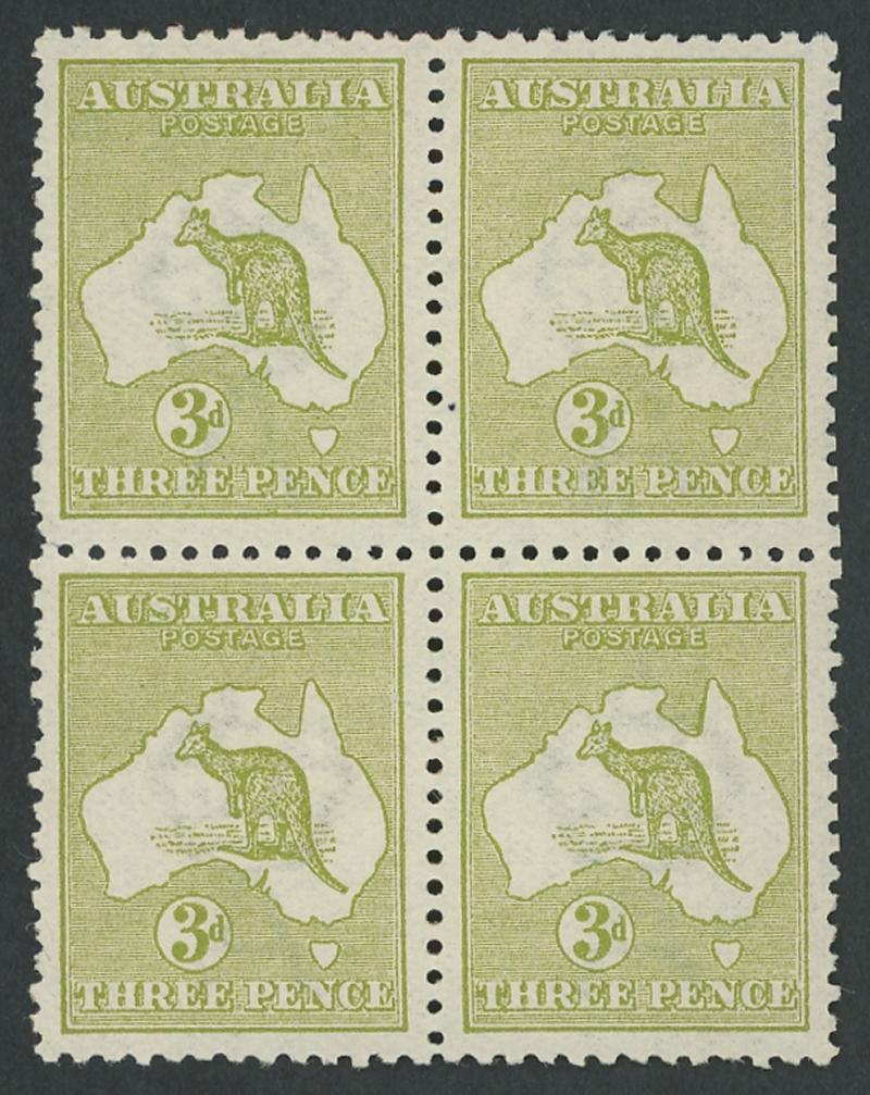3d olive-green Die I ACSC 12C (SG 5) block of 4, a few nibbled perfs, lightly mounted, Cat $1300+ for singles. (Image1) (Image2)
