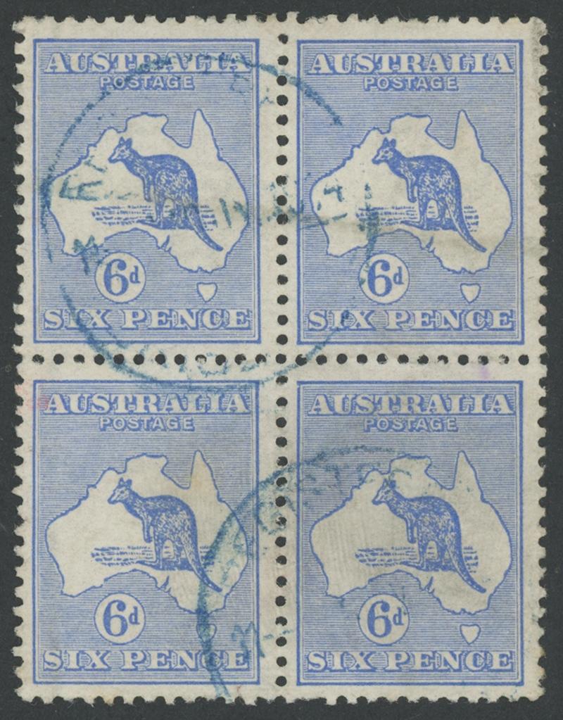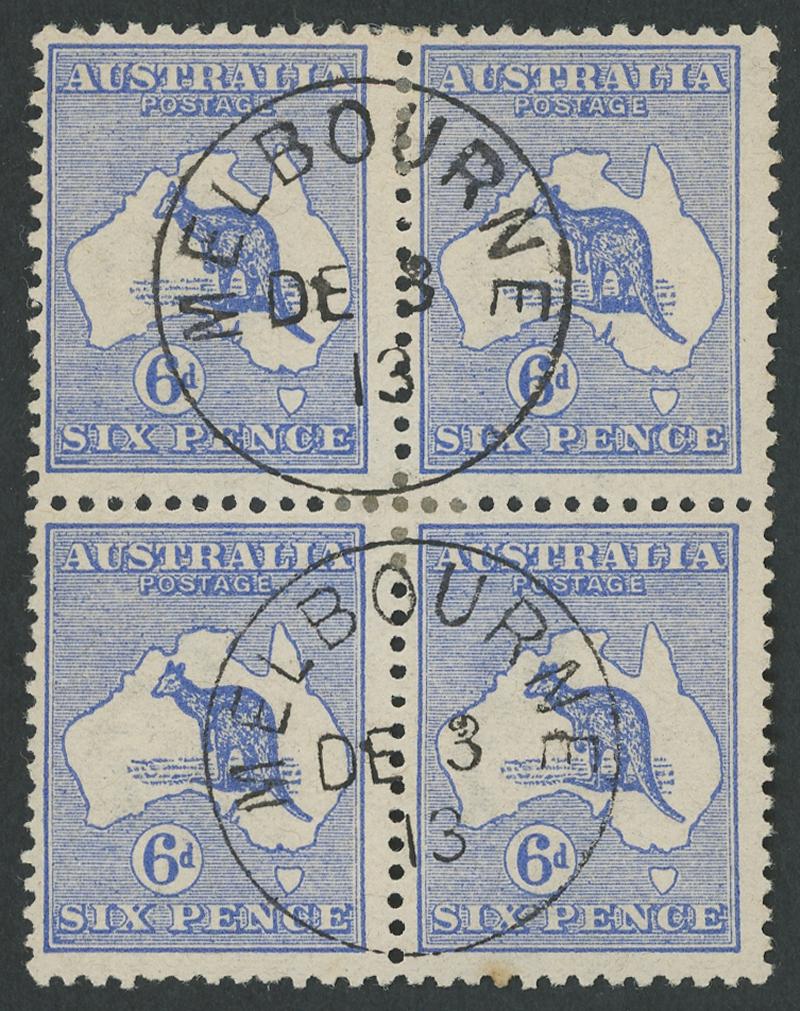 6d ultramarine SG 9 block of 4 CTO with two complete strikes of Melbourne 'DE 3/13' cds ACSC 9wc, a couple of slightly uneven perfs