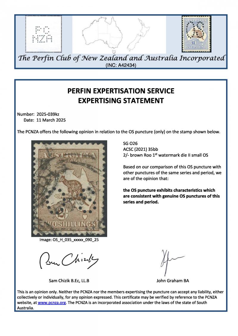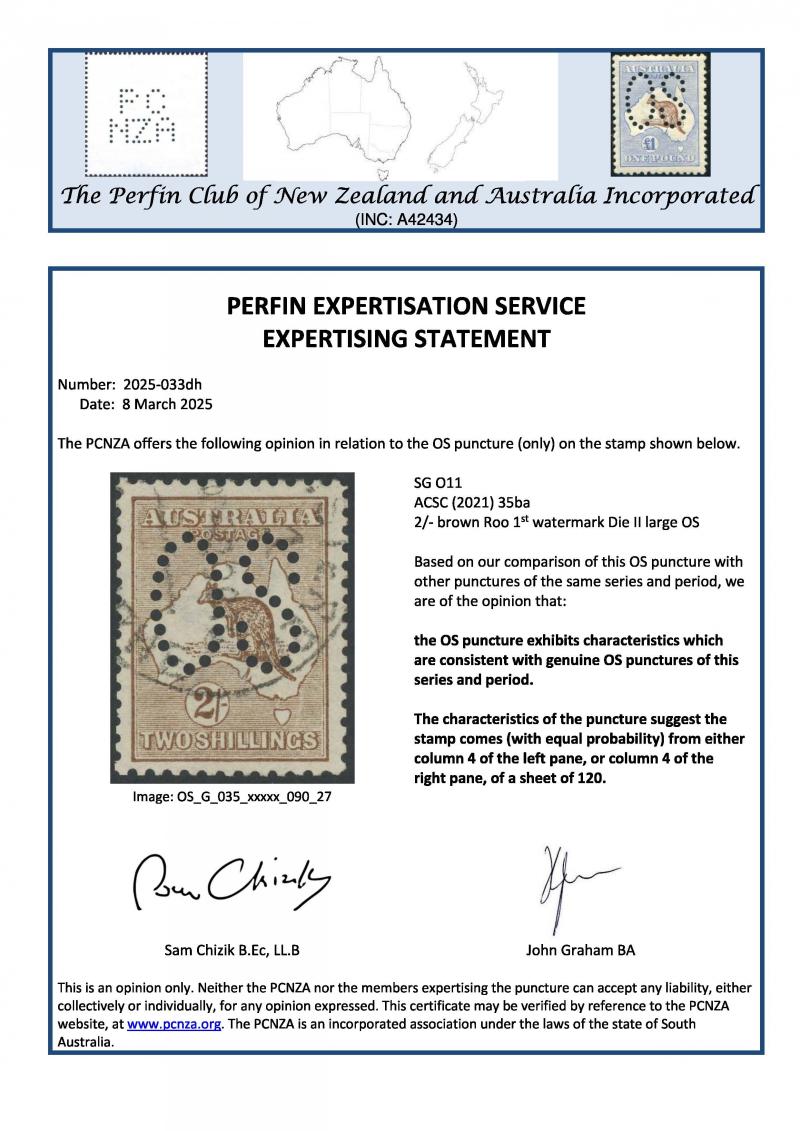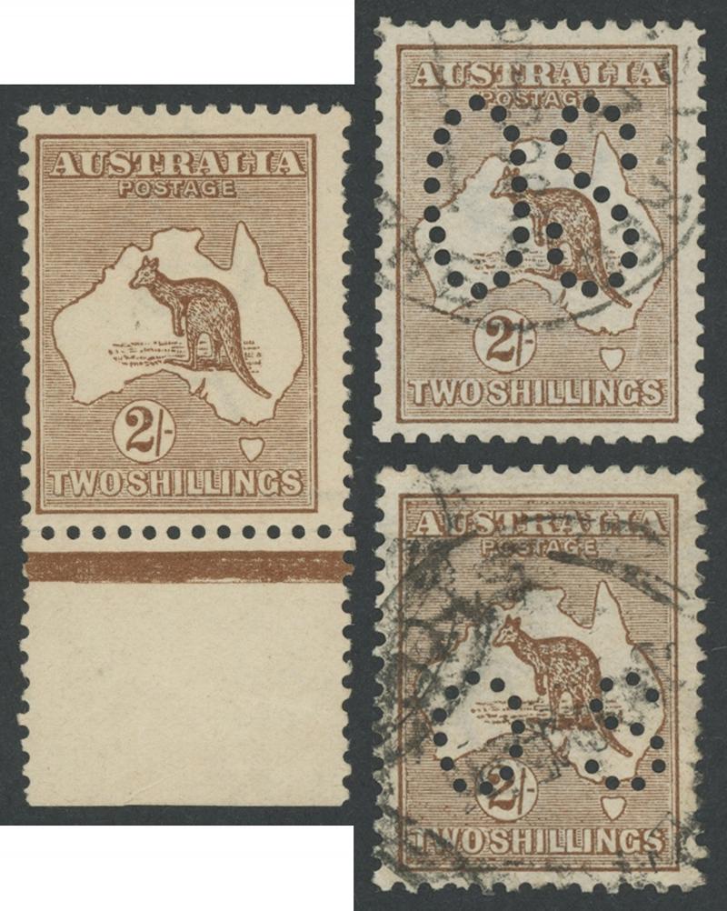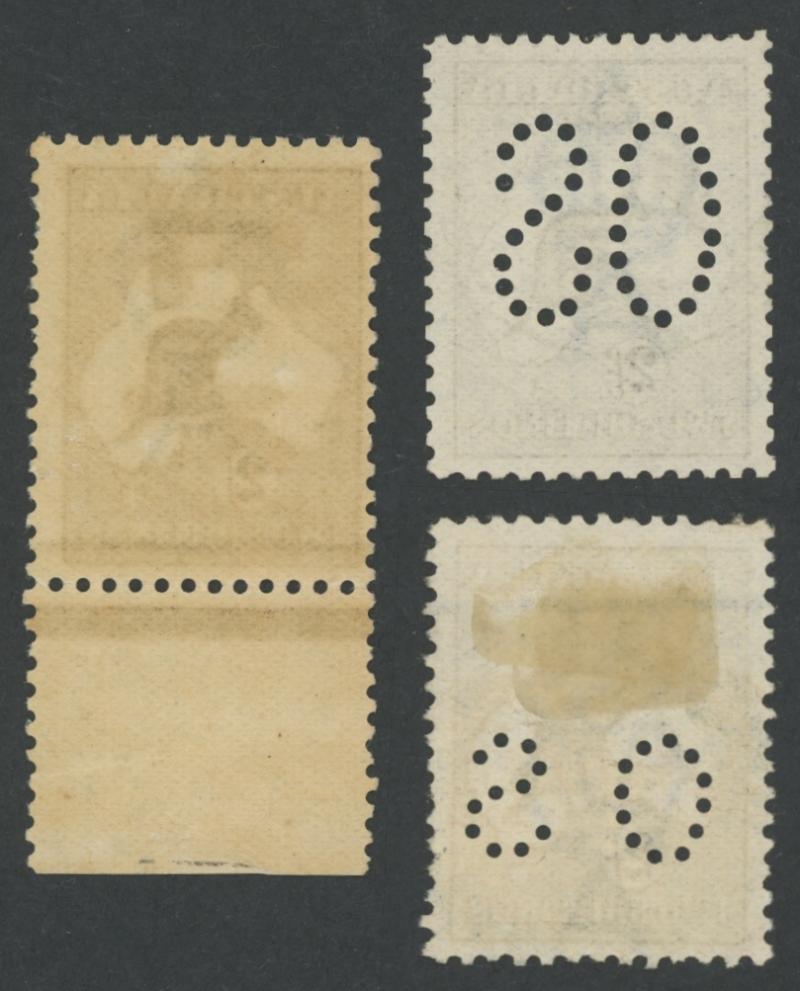 2/- brown ACSC 35A (SG 12) lower marginal single very lightly mounted plus Punctured Large 'OS' ACSC 35b (SG O11) and Punctured