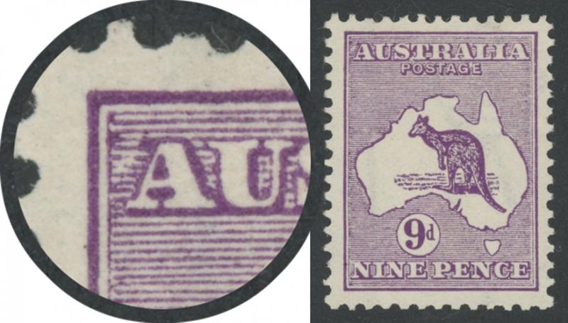 9d violet SG 10 with White Flaw Left of First 'A' of 'AUSTRALIA' [Pos 2R43] ACSC 24A(2)q, well-centred, small hinge remainder, Cat