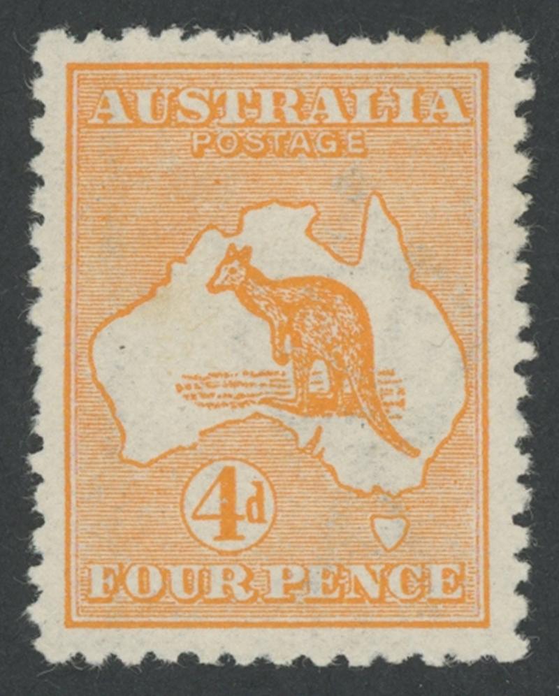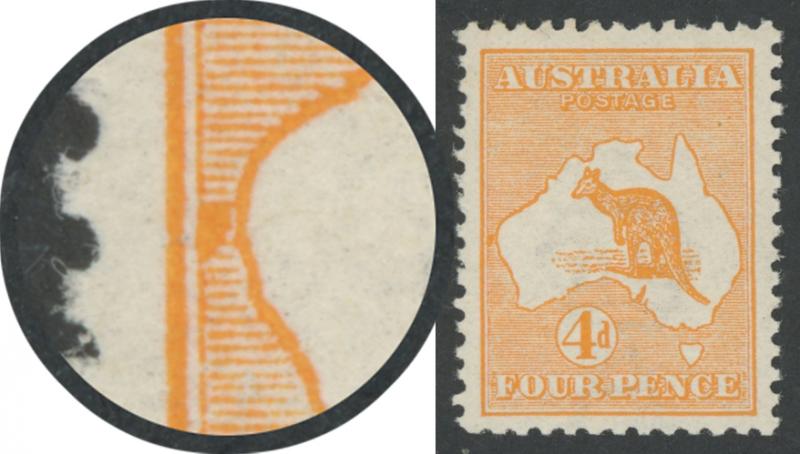 4d orange SG 6 single with Coloured Flaw Adjoining Middle of Left Frame ACSC 15A(1)d, well-centred, lightly mounted, Cat $400