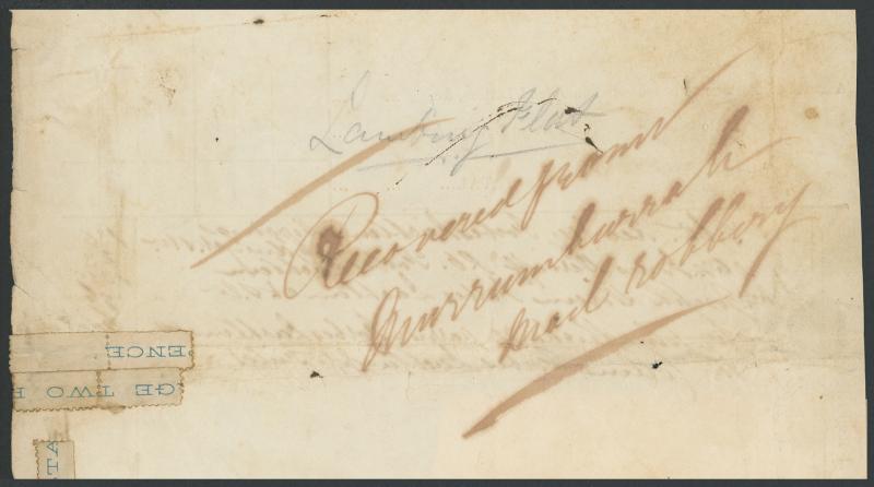 for display, Post Office endorsements at left "recovered/from Robbed/mail/ Taroom/1866/RH Watt" in pencil & on the reverse "Recovered from robbed mail from Taroom 12th inst" in red ink. Retrieved from mails stolen and ransacked by the bona fide