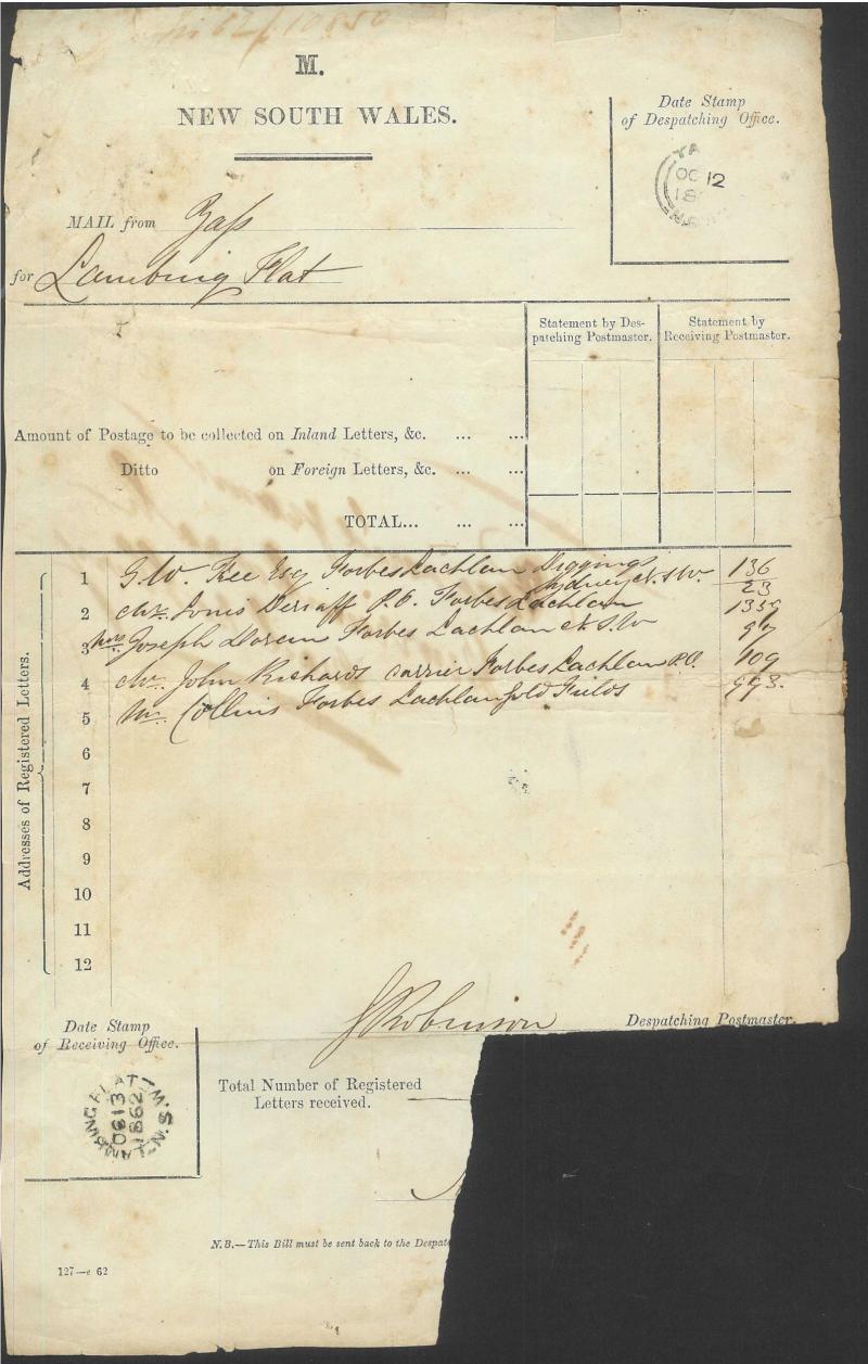1862 New South Wales large-part Post Office Way Bill for five registered letters from residents on the Forbes-Lachlan Goldfields