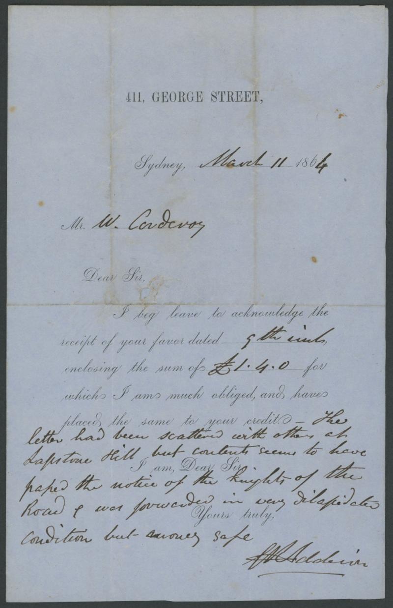 Lapstone Hill but contents seem to have passed the notice of the knights of the road & was forwarded in very dilapidated condition but money safe/CH [?] Addison", filing folds & repaired central spikehole. At about 2:15am on 11.3.1864, the Western