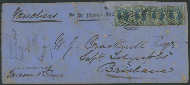 1866 Queensland OHMS cover with 'Electric Telegraph Station' imprint at lower-left with mss "Taroom 11th Jany 1866" added, endorsed