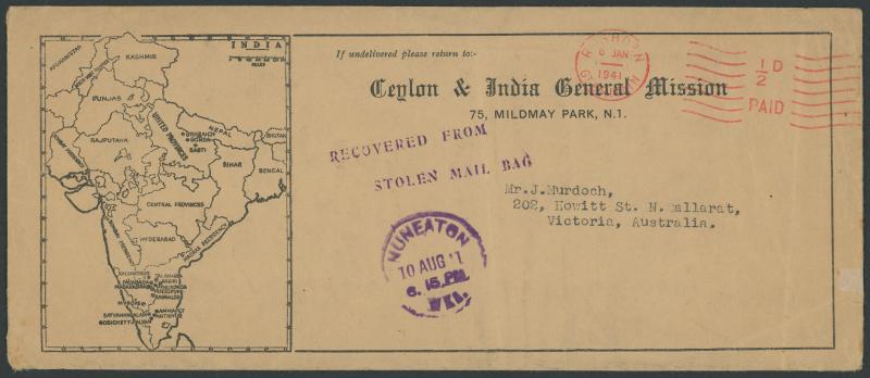very fine 'RECOVERED FROM/STOLEN MAIL BAG' & rubber 'NUNEATON/10AUG41/WKS' cds both in violet. A remarkable Printed Matter item, presumably underpaid but not taxed, delayed not by WWII but because of common criminals. (Image1) (Image2)