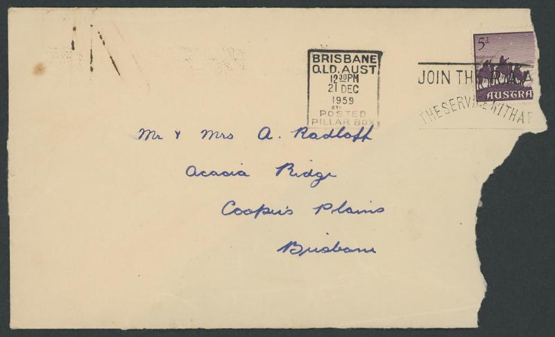 1959 (Dec 21) cover to Coopers Plains (Qld) with Christmas 5d tied by 'BRISBANE/.../POSTED IN/PILLAR BOX' machine, crudely torn