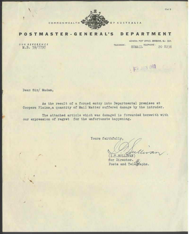 open through the stamp. With the roneo'd incident advice letter of 7.1.1960 from Brisbane GPO, advising of a mail robbery at the delivery office.