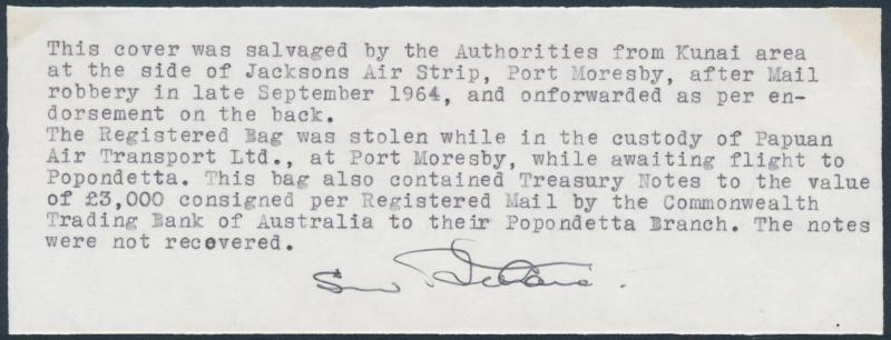 '2SE64', Popondetta cds of '3SE64' and endorsed "Received it in damaged/condition [signature] 3.9.62" referring to it being ripped open at right. With the typed incident-advice slip that inadvertently states the robbery was in "late-September" at