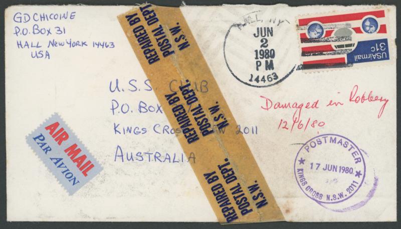 1980 United States airmail cover with 31c Plane tied by 'HALL NY/JUN/2/1980' cancel, ripped open and resealed with 'REPAIRED