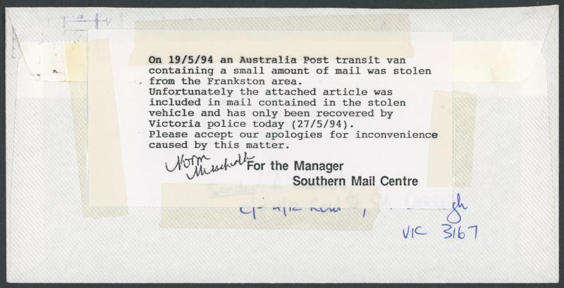 containing a small amount of mail was stolen from the Frankston area ... recovered by Victoria Police today (27.5.94) ... / Southern Mail Centre". Only one other item recorded, to Queensland. (Image1) (Image2)