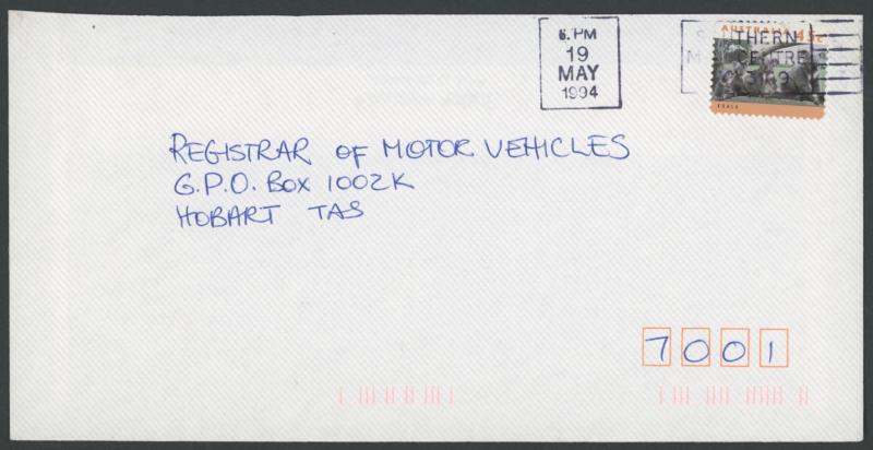 1994 (May 19) cover to Hobart with photocopied label affixed to the reverse stating "On 19.5.94 an Australia Post transit van