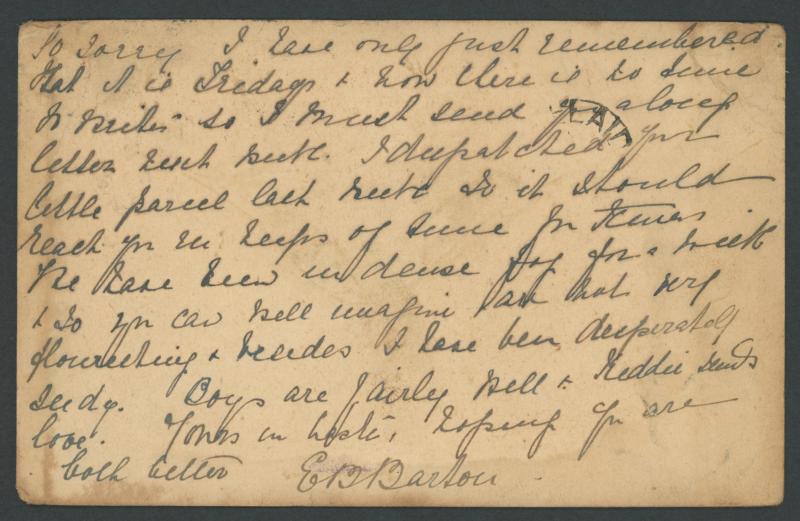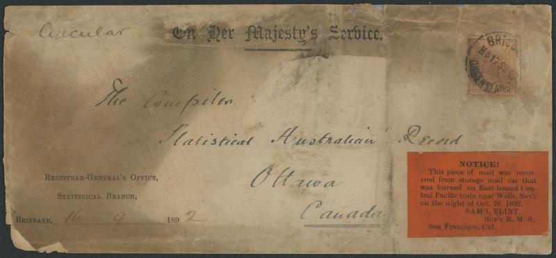damage & American black/vermilion incident advice label affixed reading 'This piece of mail was recovered from storage mail car that was burned ... near Wells Nev on the night of Oct 28 1892/ ...' Brian Peace states that only one bundle of mail from