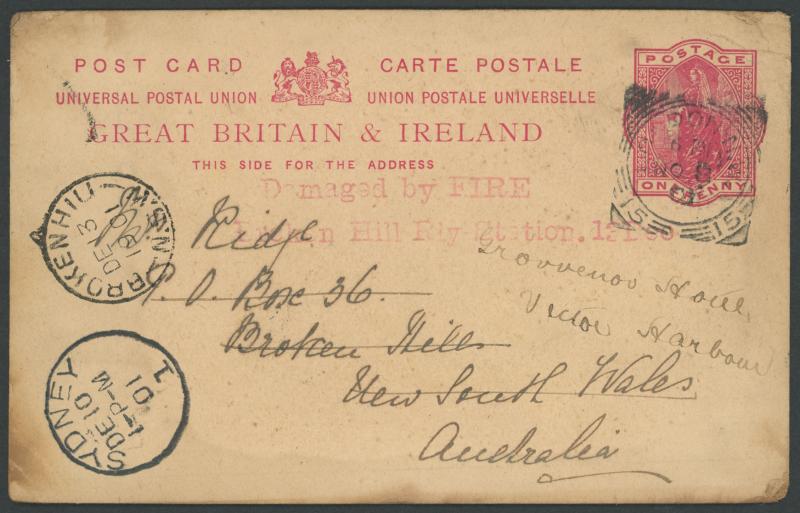 both on the face, redirected to "Grosvenor Hotel/Victor Harbour" [sic] with light but very fine 'Damaged by FIRE/Broken Hill Rly Station 13 Dec' handstamp in rosine, poor Adelaide backstamp, overall light soiling & slightly singed at the edges. A