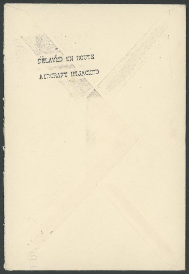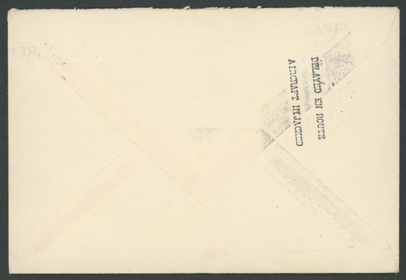 strike of the Type A 2-line 'DELAYED EN ROUTE/AIRCRAFT HIJACKED' handstamp on the reverse (with a set-off on the face), minor blemishes. The first example we have offered: Brian Peace has recorded only ten covers with the Type A cachet, compared with
