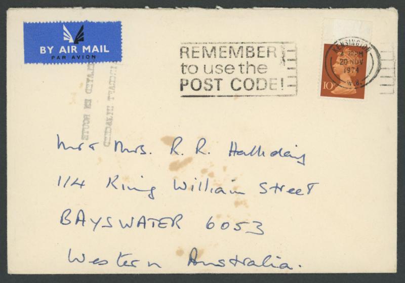 1974 Great Britain commercial airmail cover to Western Australia with 10p Machin tied by Kensington '20NOV' slogan & very fine