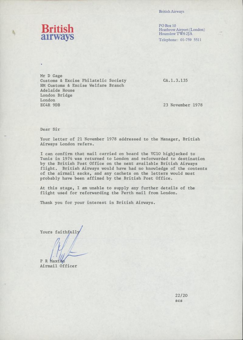 Brian Peace has recorded 42 covers with the Type B cachet. With British Airways letter of 23.11.1978 advising the hijacked mails were returned to London & forwarded on the next British Airways flight &, erroneously, 'that any cachets...would most