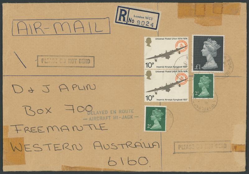 EXCHANGE PERTH/29NO74/WA-6000', minor blemishes. From the England- Australia flight hijacked at Dubai on 21.11.1974. Only mail to Western Australia received a handstamp and this is the only registered item recorded from this incident. It proves that