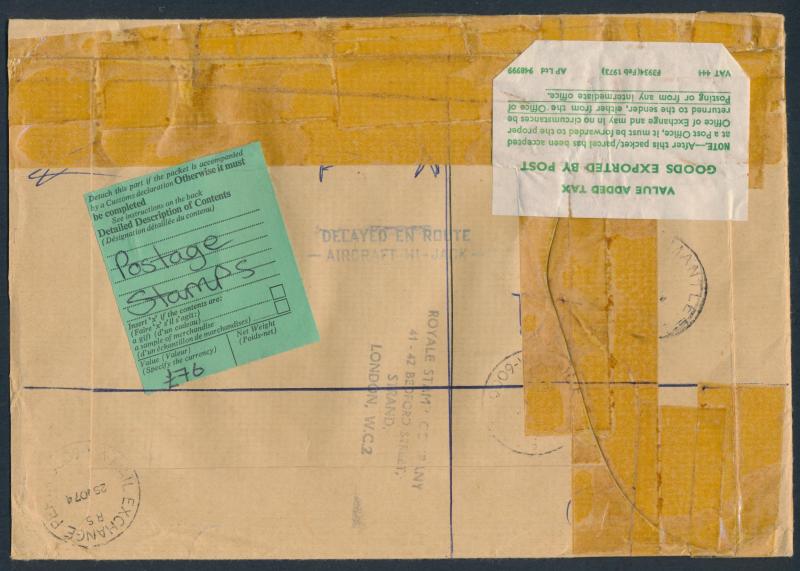 tied by 'TRAFALGAR SQUARE/20 NO/74' cds & 'London WC1' R label alongside, British Customs & VAT labels on the reverse, superb strike of the Type B 2-line 'DELAYED EN ROUTE/-AIRCRAFT HI-JACK-' handstamp in blue (another strike on the reverse), 'MAIL