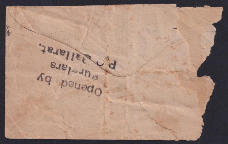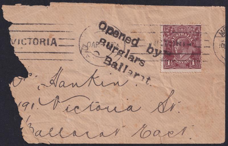 front & back of the very rare 'Opened by/Burglars/P.O. Ballarat' handstamp, ripped open at left with tears repaired with archival tape, light toning. Over 700 mail items were ransacked by thieves at the Ballarat PO over the weekend of 11-12.4.1920: