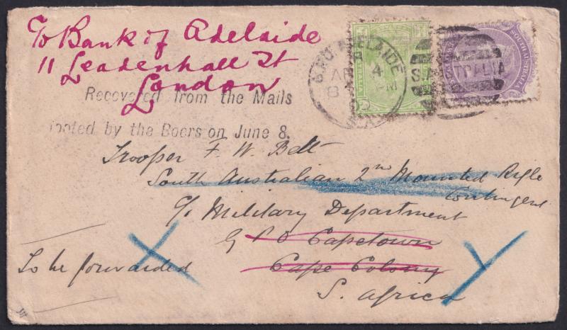 1900 South Australia cover to a member of the South Australian 2nd Mounted Rifles in South Africa, very fine 'Recovered from the