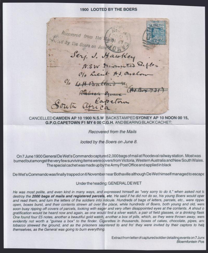 backstamp, largely very fine 'Recovered from the Mails/looted by the Boers on June 8' cachet, overall soiling and reinforced central horizontal fold, opened-out for display. Incoming mail to Boer War soldiers is very scarce. Brian Peace records only