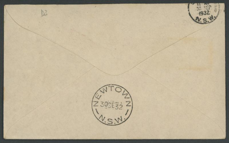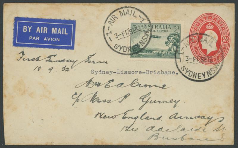 1932 (Sep 18) Inaugural Sydney-Brisbane Sunday Service usage of KGV 2d Envelope with 3d Airmail tied by Sydney cds of 17SE32,