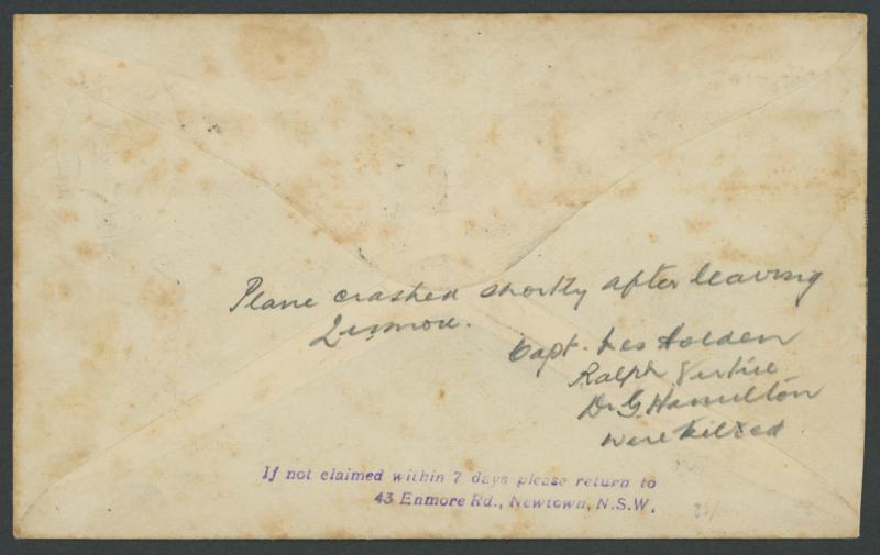 Cloncurry (Qld) where he took evasive action to avoid a flock of goats, flipped and destroyed his plane, Harbour Bridge 3d only affixed & cancelled on arrival at 'BRISBANE/12DE32/...', signed by the pilot at lower-left. Unlisted in the AAMC. See