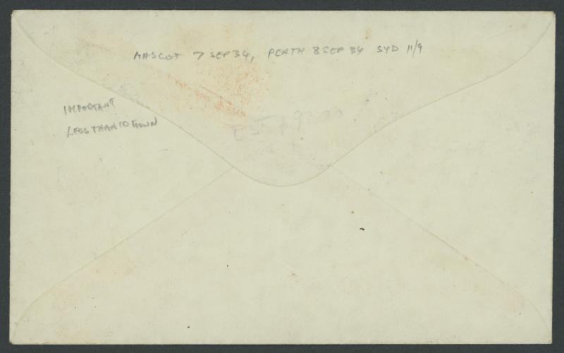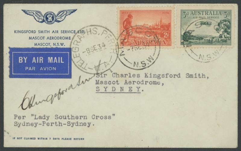 1934 (Sep 9) Sydney-Perth-Sydney 'boomerang' cover per 'Lady Southern Cross' with 2d & 3d tied by 'MASCOT/7SE34/NSW' cds &