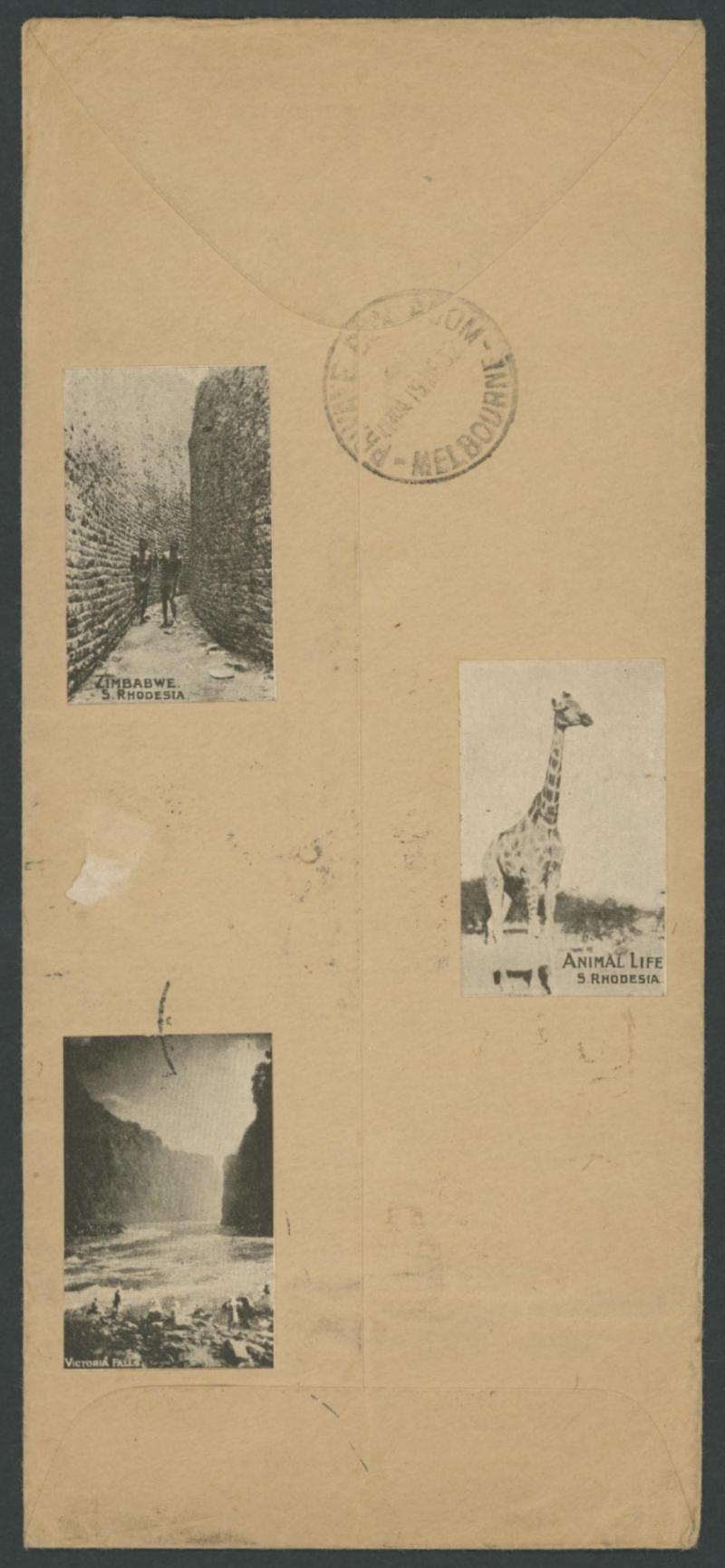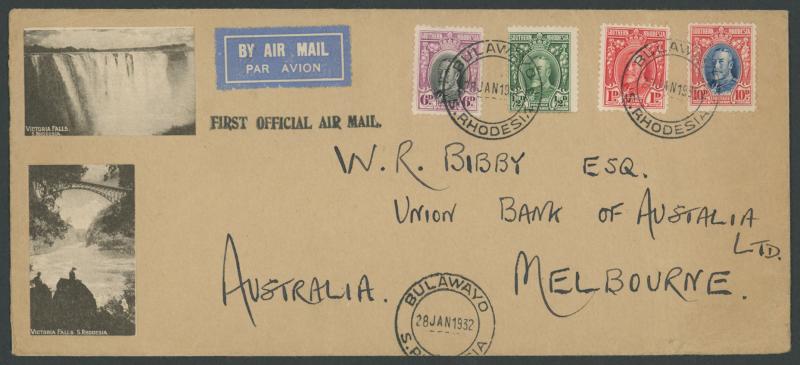 1932 (Jan 28) cover from Southern Rhodesia with 'FIRST OFFICIAL AIR MAIL' cachet, various monochrome tourism labels on both sides.