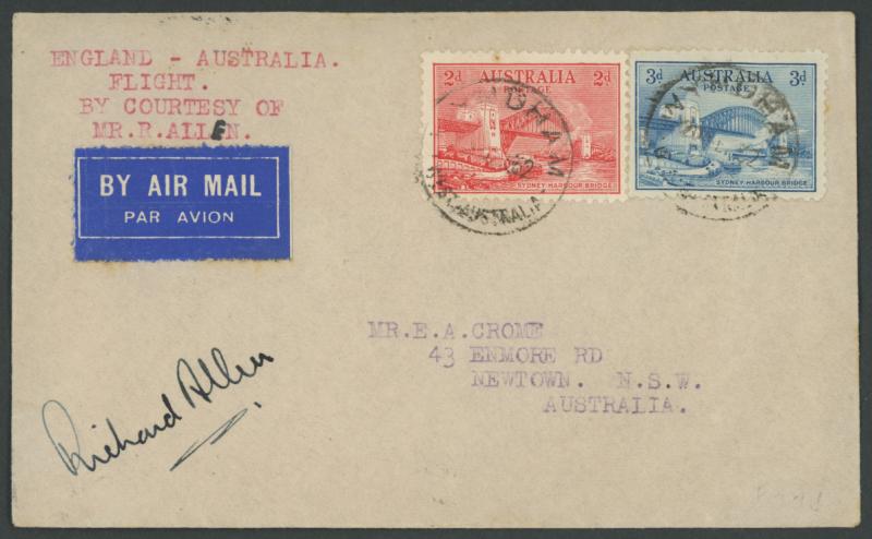 1932 (Aug) England-Australia per Richard Allen who fell ill with dysentery at Baghdad, delaying him for 10 days, Harbour Bridge 2d