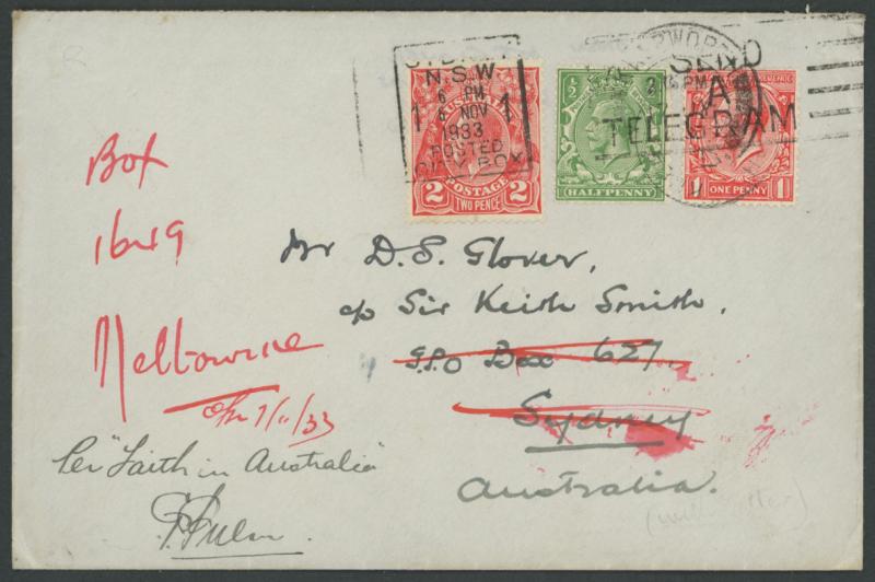 1933 (July) England-Australia via America per 'Faith in Australia' with Great Britain KGV ½d green & 1d red tied by 'KNEBWORTH/