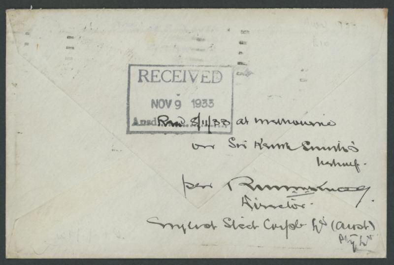 20.10.1933 & setting a new England-Australia record, carried on to Sydney where KGV 2d red affixed tied by Sydney slogan cancel of 6NOV/1933, signed on the face by the pilot "CTP Ulm", redirected to Melbourne with boxed 'RECEIVED/NOV 9 1933/...'