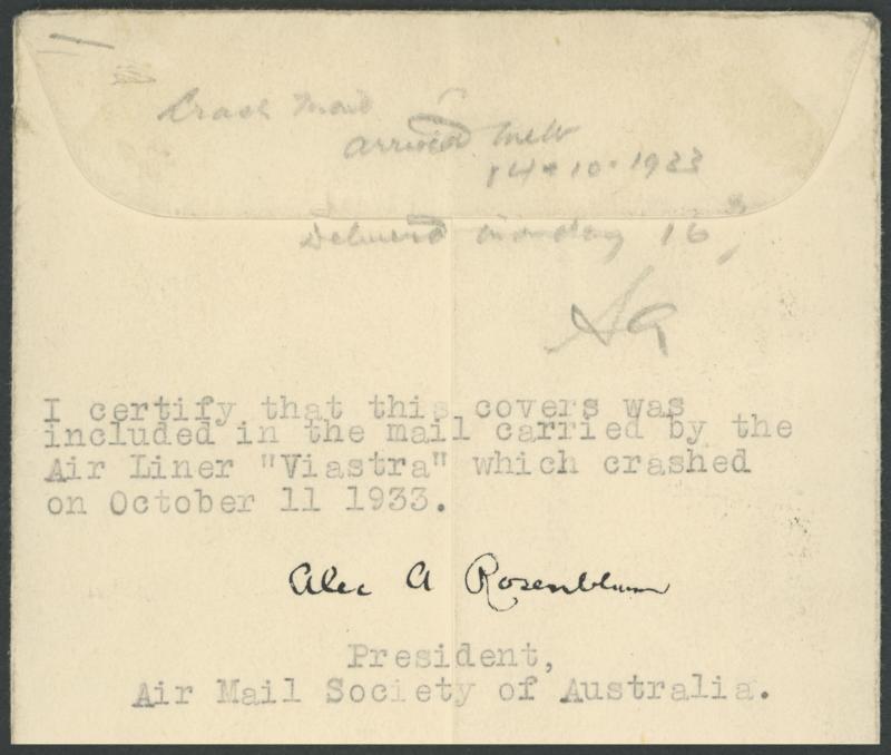 the reverse signed "Alec A Rosenblum"/President/Air Mail Society of Australia", reinforced central fold, AAMC 336, Cat $500. Probably because the mail wasn't damaged - and no cachet was applied - this is the only recorded cover. Illustrated in Volume